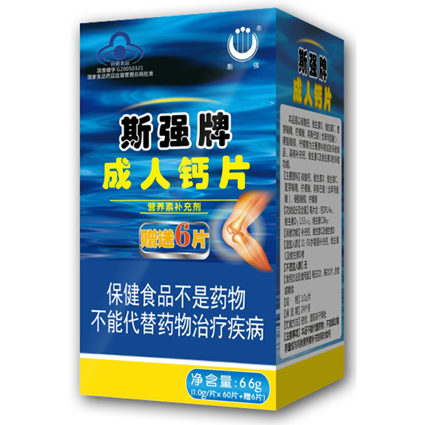斯强牌成人钙片帮助钙的吸收,有利于钙在骨骼中沉积、保持骨骼弹性,使关节更灵活。口感好,可含食或嚼食。减轻肠胃负担。少量多次服用,吸收效果好。