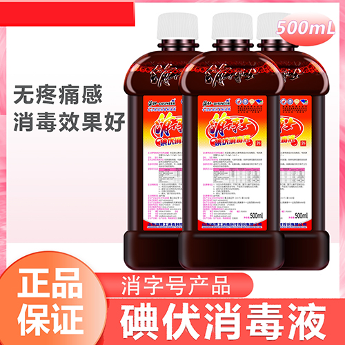 产品成分:本品是以碘为主要有效成分的消毒液,有效碘含量为4.5g/L—5.5g/L(w/v)
