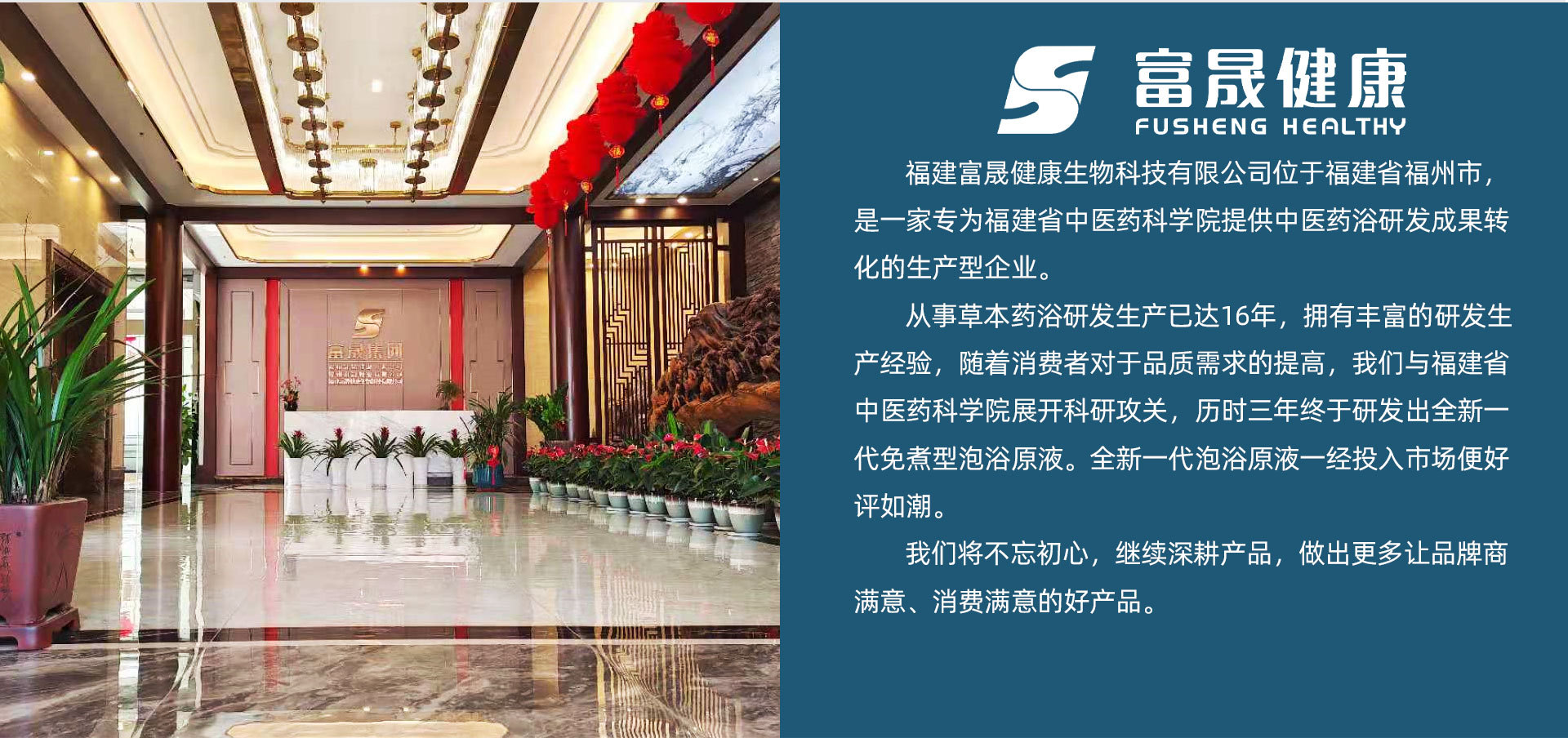 福建富晟健康生物科技有限公司是一家专门为福建省中医药科学院实现中医药研发科技成果转化并实现产业化的公司,2017年公司联合中医药科学院针对传统中医药浴领域展开科研攻关,针对现有足浴、泡浴产品不足之处,开创性的提出“一禁止、五必须”的中医药浴产品新标准。根据以上标准成功研发出了新一代中医药泡浴抑菌液系列健康产品,新产品的配方及制备工艺成功提交申请了8项国家发明专利,在公司的努力下已成功实现产业化。