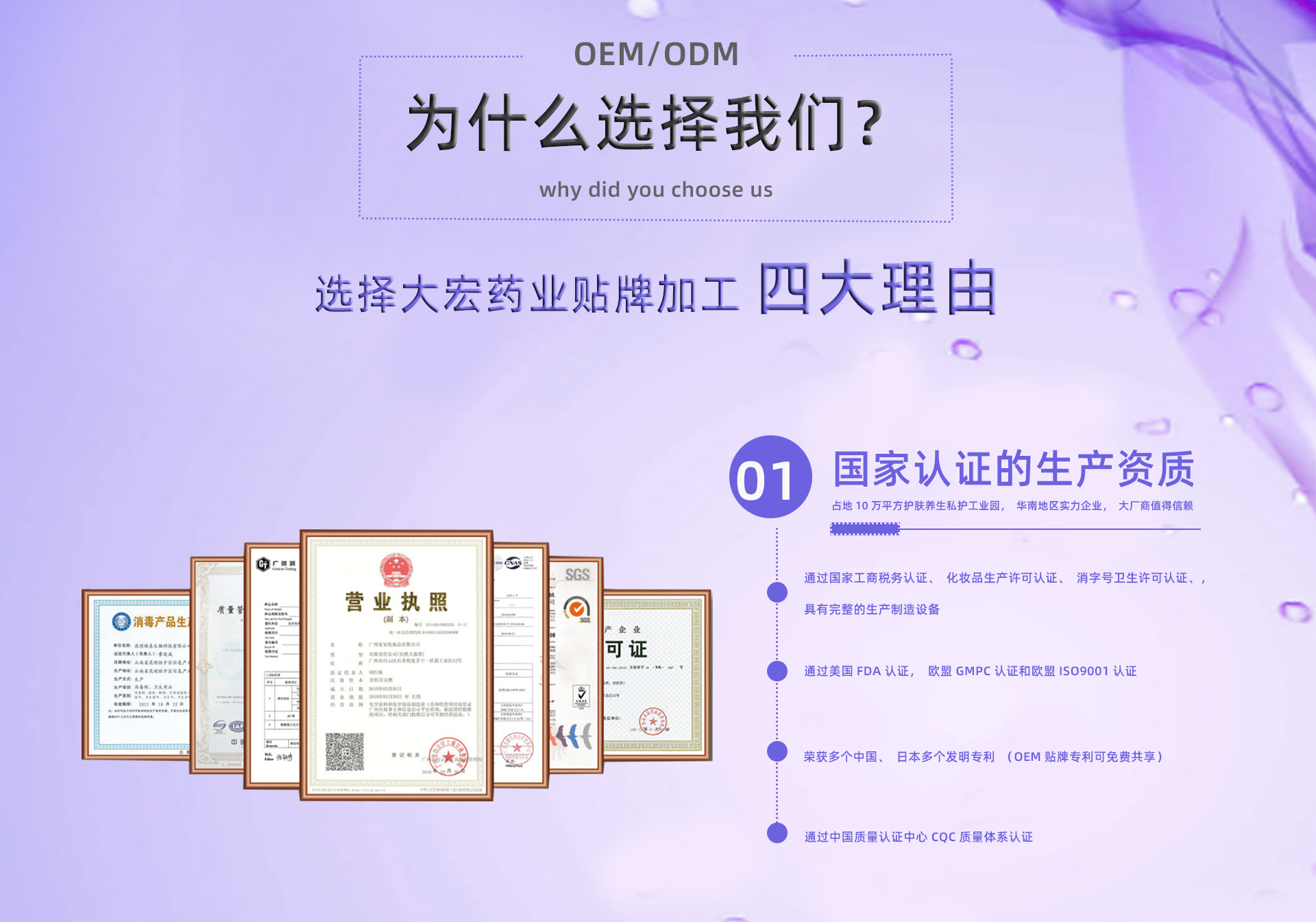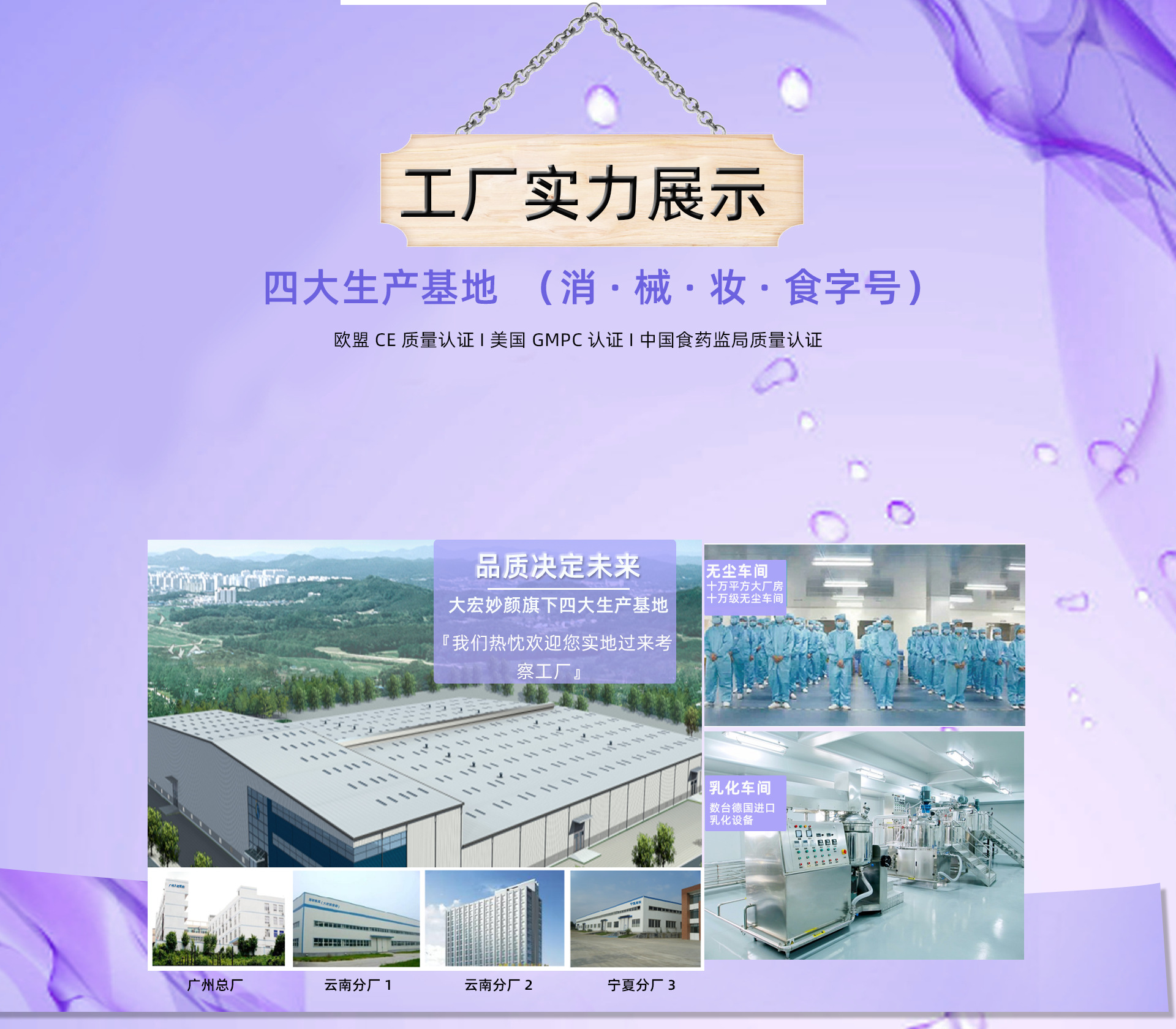广州大宏妙颜生物是广东家安集团旗下一家集护肤、养生、私密、口服酵素、等产品专业OEM/ODM一条龙服务的公司,拥有完整、科学的质量管理体系。 拥有妆字号、消字号、械字号、食字号四大生产许可证。 公司拥有专业海内外研究团队,支持代研发新品、来样仿样、等多种灵活方式。公司秉承“客户至上、锐意进取”的经营理念,坚持安全合法、优质服务的原则为广大客户提供服务公司的诚信、实力和产品质量均获得业界的认可。(被评为质量诚信AAAAA企业)欢迎各界朋友莅临参观、指导和业务洽谈。