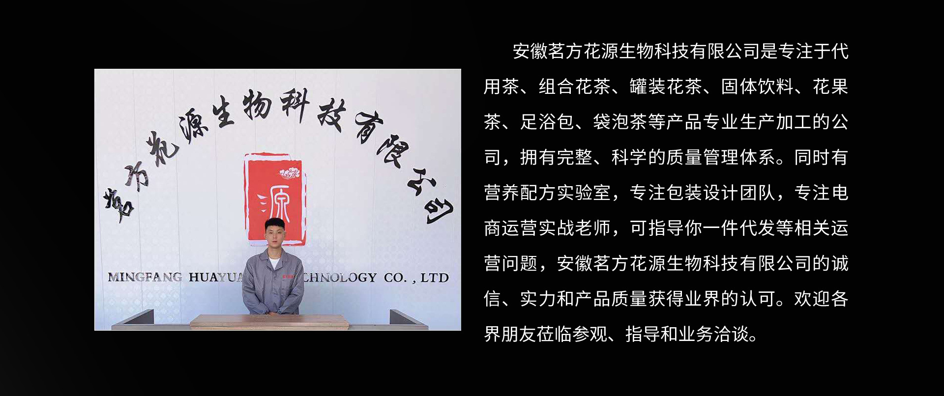 安徽茗方花源生物科技有限公司是专注于代用茶,组合花茶,罐装花茶,三角包,固体饮料,足浴包,袋泡茶等产品专业生产加工的公司,拥有完整,科学的质量管理体系。同时有营养配方的实验室,专注包装设计团队,专注电商运营实战老师,可指导你一件代发等相关运营问题,安徽茗方花源生物科技有限公司的诚信,实力和产品质量获得业界的认可。欢迎各界朋友莅临参观,指导和业务洽谈。