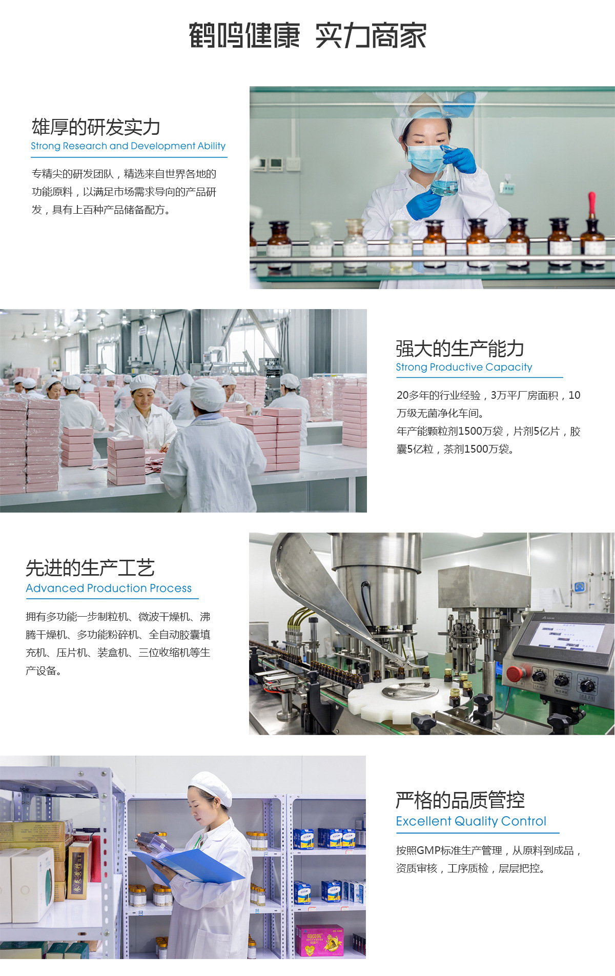 陕西鹤鸣健康科技有限公司成立于1996年,注册资金2800万元。现拥有100余亩的生产厂区,2万余平米净化车间,拥有软胶囊、硬胶囊、片剂、粉剂、颗粒剂、口服液等保健食品现代化生产线,以及固体饮料、植物饮料、压片糖果、凝胶糖果、浓缩果蔬汁、代用茶、方便食品、植物油等功能食品生产线。目前已通过ISO9001、HACCP认证、SGS认证、清真认证以及美国FDA注册等在内的多项资格注册和认证,产品获欧美等多个国家市场准入资格。