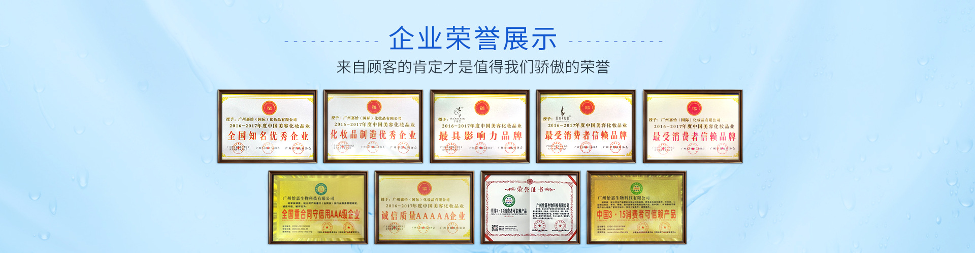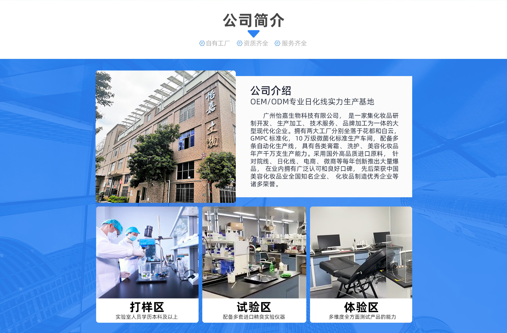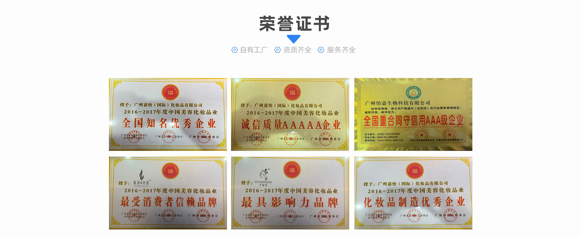 广州怡嘉生物科技有限公司,是一家集化妆品研制开发、生产加工、技术服务、品牌加工为一体的大型现代化企业。拥有GMPC标准化,10万级微菌化标准生产车间,配备多条自动化生产线,具有各类膏霜、洗护、美容化妆品年产千万支生产能力。采用国外高品质进口原料,针对院线、日化线、电商、微商等每年创新推出大量爆品,在业内拥有广泛认可和良好口碑,先后荣获中国美容化妆品业全国知名企业、化妆品制造优秀企业等诸多荣誉。