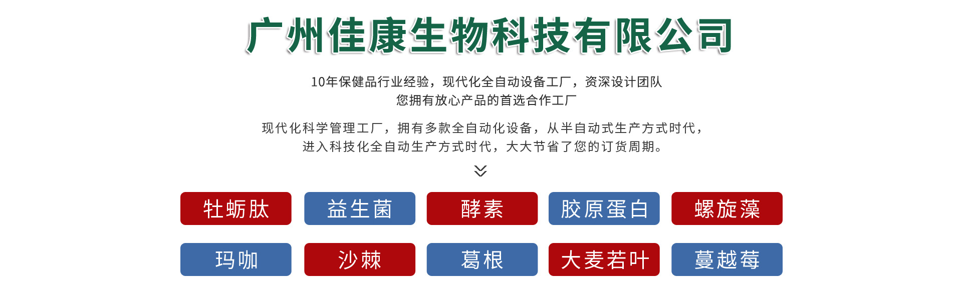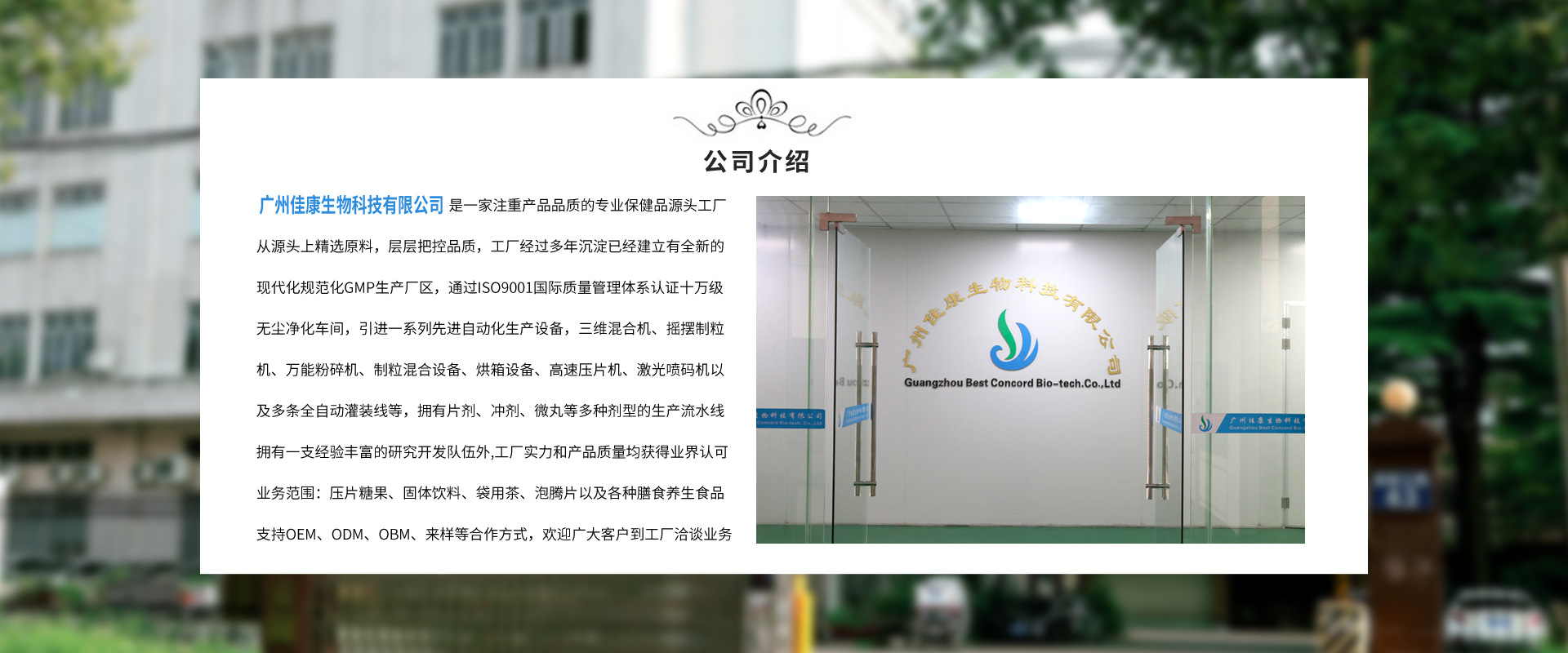 广州佳康生物科技有限公司是压片糖果、固体饮料、袋泡茶;男性片剂、女性片剂、老人保健品、少儿保健品、原料等产品专业生产加工的公司,拥有完整、科学的质量管理体系,通过ISO90001质量管理体系认证。广州佳康生物科技有限公司的诚信、实力和产品质量获得业界的认可。欢迎各界朋友莅临参观、指导和业务洽!