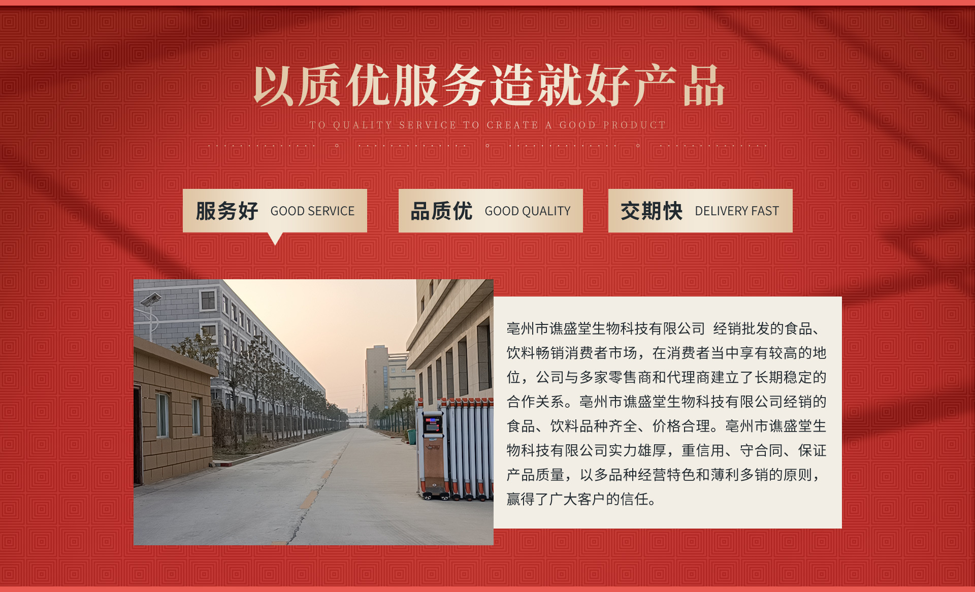 本公司主要以生产熟粉类糕点黑芝麻丸,方便食品冲调类膏滋,固态调味料煲汤料,压片糖果为主的生产企业,几年来为全国各类电商,超市,药店,商贸公司提供优质的产品和售后服务,公司以创新务实,诚信经营为宗旨,热忱欢迎各界同仁洽谈合作