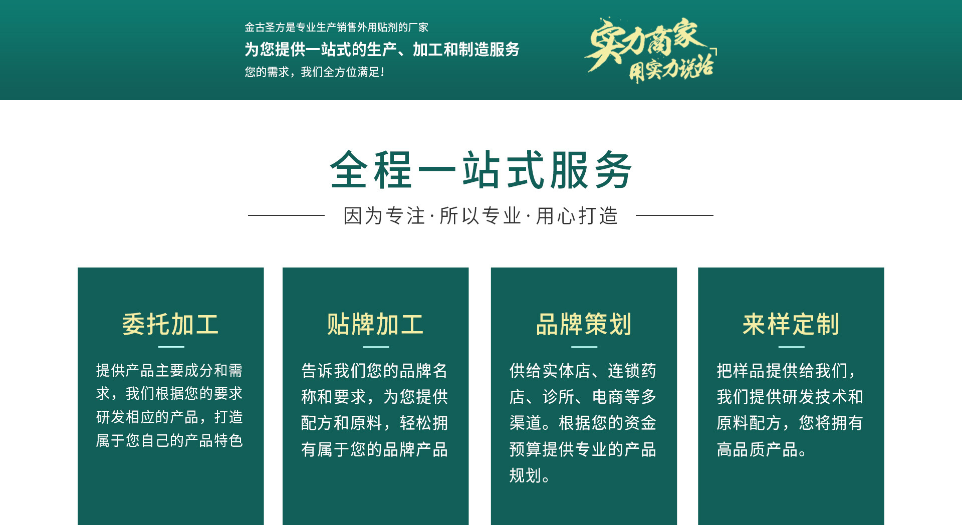 郑州金古圣方药业有限公司&河南金古圣方生物科技开发有限公司(生产企业), 弘扬中医文化,致力百姓健康!公司主要生产、销售祖国中医五大药物剂型之一的膏药贴剂;优势产品:汉方贴小儿穴位贴,失眠贴,眼贴,足贴,前列腺贴,三伏贴,三九贴,鼻炎膏,痔疮膏,戒烟贴、乳腺贴、口苦口臭贴、小儿化积健脾贴、小儿腹泻贴、小儿咳喘贴、小儿解感贴、小儿消食贴、筋骨疼痛贴、酸麻肿痛贴、颈肩腰腿贴、万痛筋骨贴等产品。 金古圣方药业公司贯彻"质量保障"的原则,以“关爱生命、关注健康、奉献社会”为企业理念,与国内多家医学机构合作,凭借“诚信、沟通、双赢、永续”的经营理念,赢得代理商与消费者的良好口碑