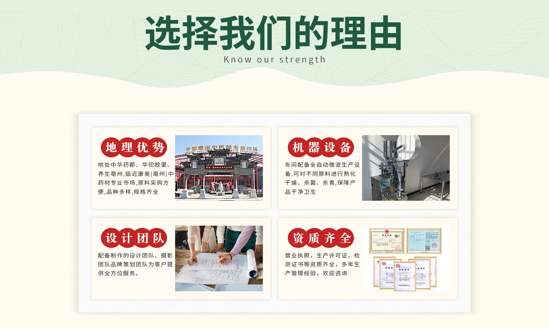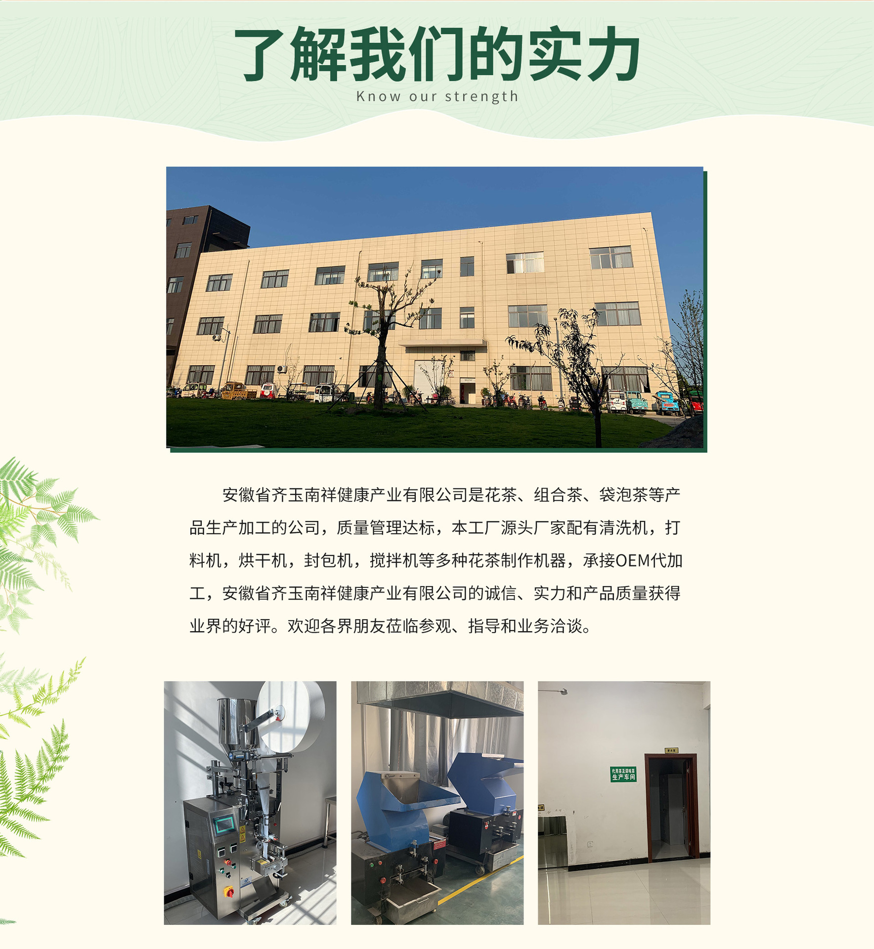 安徽省齐玉南祥健康产业有限公司是花茶、组合茶、袋泡茶等产品生产加工的公司,质量管理达标,本工厂源头厂家配有清洗机,打料机,烘干机,封包机,搅拌机等多种花茶制作机器,承接OEM代加工,安徽省齐玉南祥健康产业有限公司的诚信、实力和产品质量获得业界的好评。欢迎各界朋友莅临参观、指导和业务洽谈。