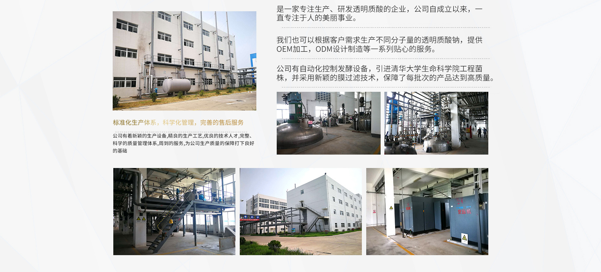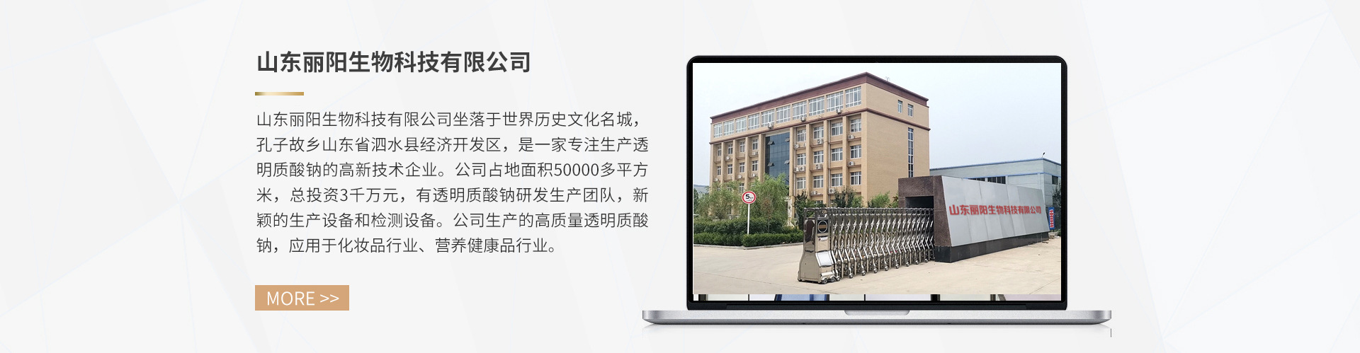 丽阳生物坐落于美丽的东方圣城,孔子故里-山东曲阜,是一家专业生产、研发透明质酸的企业,公司自成立以未标题-1.jpg来,一直专注于人的健康美丽事业。历经十年,我公司生产的食品级透明质酸钠、化妆品级透明质酸钠、透明质酸钠溶液、玻尿酸原液等产品以纯度高,蛋白含量低,澄清度好,分子量全以及优良的性价比畅销海内外并得到客户的一致好评。我们也可以根据客户需求生产不同分子量的透明质酸钠,提供OEM代工,ODM设计制造等一系列优越的服务。公司拥有一流的自动化控制发酵设备,引进清华大学生命科学院专利基因工程菌株,并采用国际领先的膜过滤技术,保证了每一批次的产品达到高质量、高纯度。 丽泽天下,阳光你我!曲阜市丽阳生物制品有限公司不断创新、锐意进取,只为把更好的产品奉献给追求健康美丽的朋友们,我们始终坚持与客户同成长,与健康美丽事业共相随!秉承“诚信、务实、创新、共赢、健康、快乐”的企业理念。