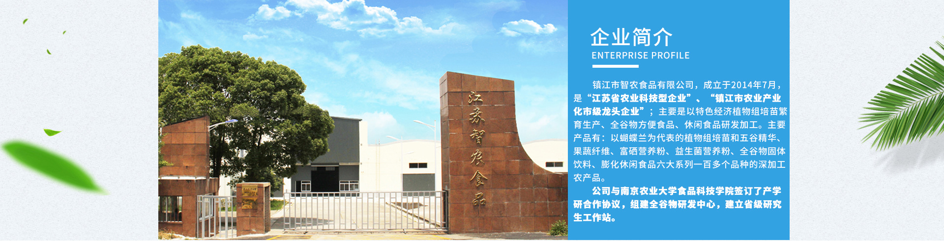 镇江市智农食品有限公司,江苏省农业科技型企业,镇江市农业产业化龙头企业,成立于2013年7月,坐落于镇江市丹徒区经济开发区,占地面积18000平方米。公司经过6年的发展,形成了集特色蔬菜、花卉繁育生产、全谷物和畜禽方便休闲食品研发与加工和电子商务为一体的综合型科技企业。依托南京农业大学为技术平台,与南京农业大学食品科技学院签订了产学研合作战略框架协议,进行全面的人才培养、技术革新和新产品研发合作,组建了“南农-智农全谷物研发中心”,建立了江苏省企业研究生工作站,为新产品的研发以及产品的质量控制提供了技术保障。 公司始终坚持“五谷为本,崇尚自然之源”的经营理念,“坚持、责任、敬业、科技、品牌”的服务宗旨,为客户提供健康、美味、安全的食品。