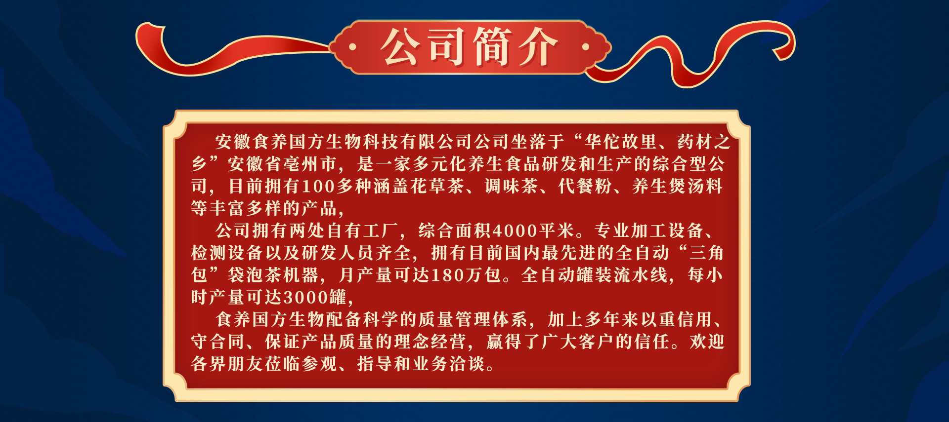 安徽乐迪生物科技有限公司公司坐落于“华佗故里、药材之乡”安徽省亳州市,是一家多元化养生食品研发和生产的综合型公司,目前拥有100多种涵盖花草茶、调味茶、代餐粉、养生煲汤料等丰富多样的养生产品,拥有两处自有工厂,综合面积4000平米。专业加工设备、检测设备以及研发人员齐全,拥有目前国内最先进的全自动“三角包”袋泡茶机器,月产量可达180万包。全自动罐装流水线,每小时产量可达3000罐,配备科学的质量管理体系,加上多年来以重信用、守合同、保证产品质量的理念经营,赢得了广大客户的信任。欢迎各界朋友莅临参观、指导和业务洽谈。