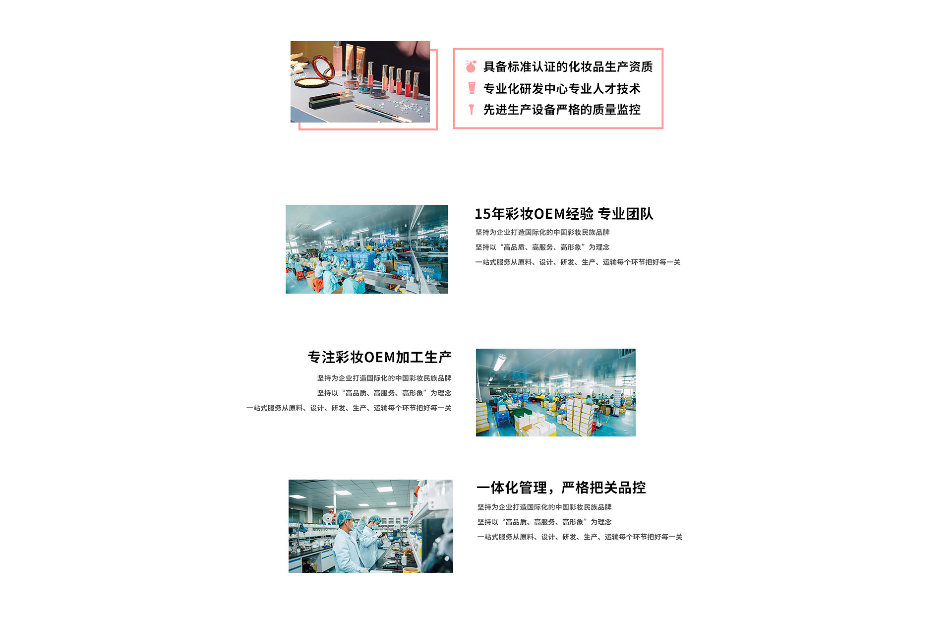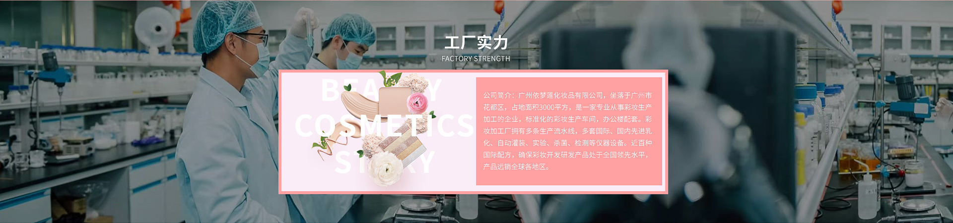 公司简介:广州依梦莲化妆品有限公司,坐落于广州市花都区,占地面积3000平方,是一家专业从事彩妆生产加工的企业,标准化的彩妆生产车间,办公楼配套。彩妆加工厂拥有多条生产流水线,多套国际、国内先进乳化、自动灌装、实验、杀菌、检测等仪器设备。近百种国际配方,确保彩妆开发研发产品处于全国领先水平,产品远销全球各地区。