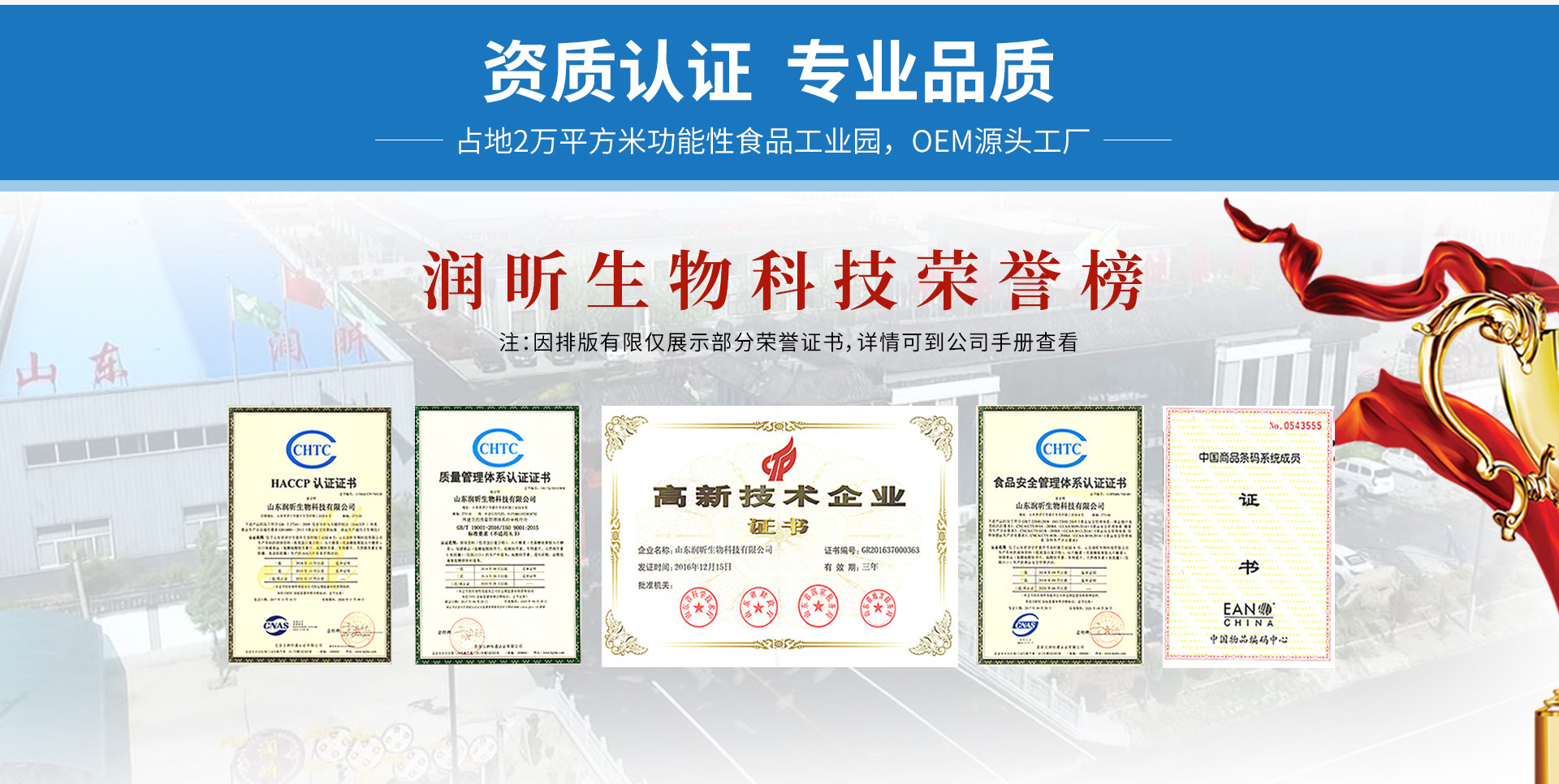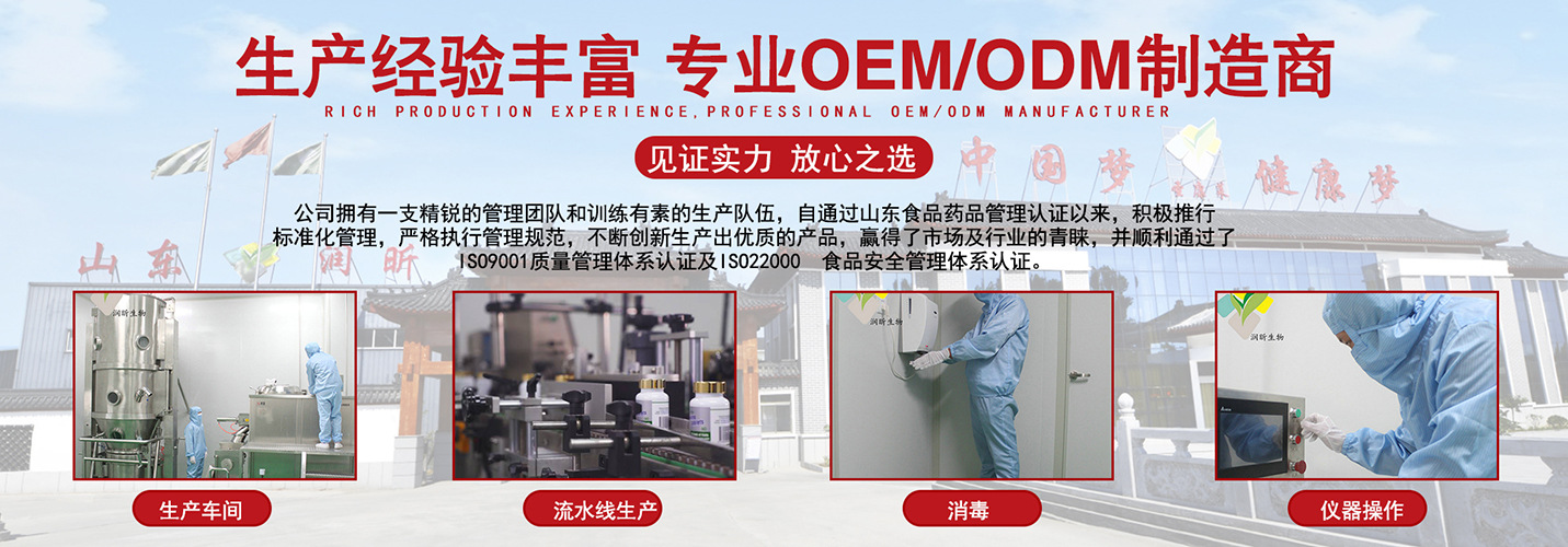 山东润昕生物科技有限公司坐落于孔子故里——曲阜,现有QS认证和GMP标准厂房车间,研发设备、生产、检验仪器齐全,严格按照ISO和GMP进行质量管理,确保产品质量符合国家标准。