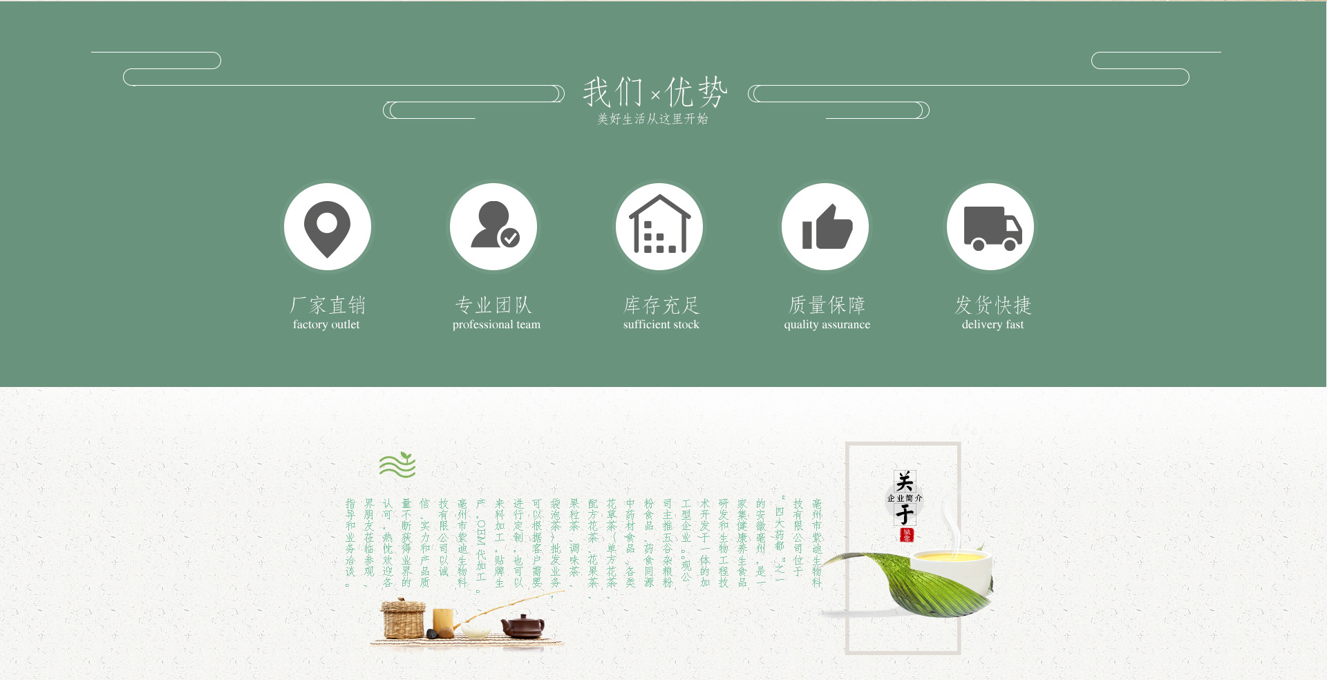 亳州市紫迪生物科技有限公司位于全国“四大药都”之首的亳州,坐落于高新区第八社区管理中心产业园区,是一家集健康养生食品研发和生物工程技术开发于一体的加工型企业。公司具有养生花草茶和方便食品两个生产资质,拥有2300余平方米的SC认证的标准化生产车间及其设施齐全的质检室、微生物室,制订了一套完整、科学的质量管理体系来确保产品质量。现公司主推五谷杂粮粉粉食品、药食同源中药材食品、各类花草茶(单方花茶、配方花茶、花果茶、果粒茶、调味茶、袋泡茶)批发及零售业务,可以根据客户需要进行定制,也可以来料加工、贴牌生产、OEM代加工。拥有六条组合配方花草茶生产线,日出货量最高15-20万包左右;拥有两条半自动粉剂独立包装生产线,日出货量1万盒以上;拥有两条全自动三角包内外袋包装设备,日产出货量5千盒以上。 百尺竿头更进一步,随着业务的拓展和对大健康概念的探索,亳州市紫迪生物科技有限公司以绿色、健康、时尚、营