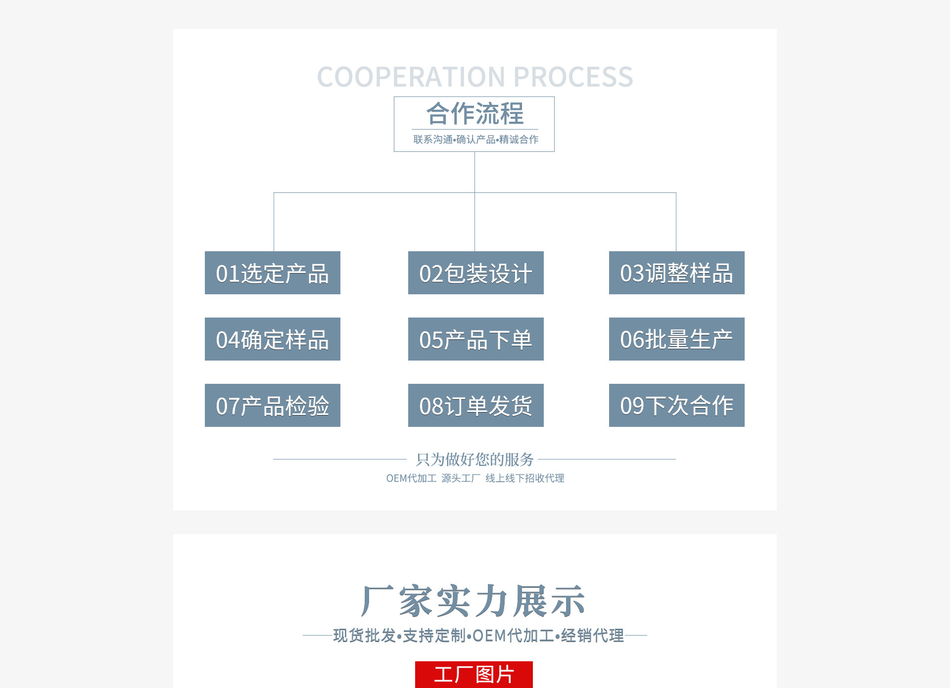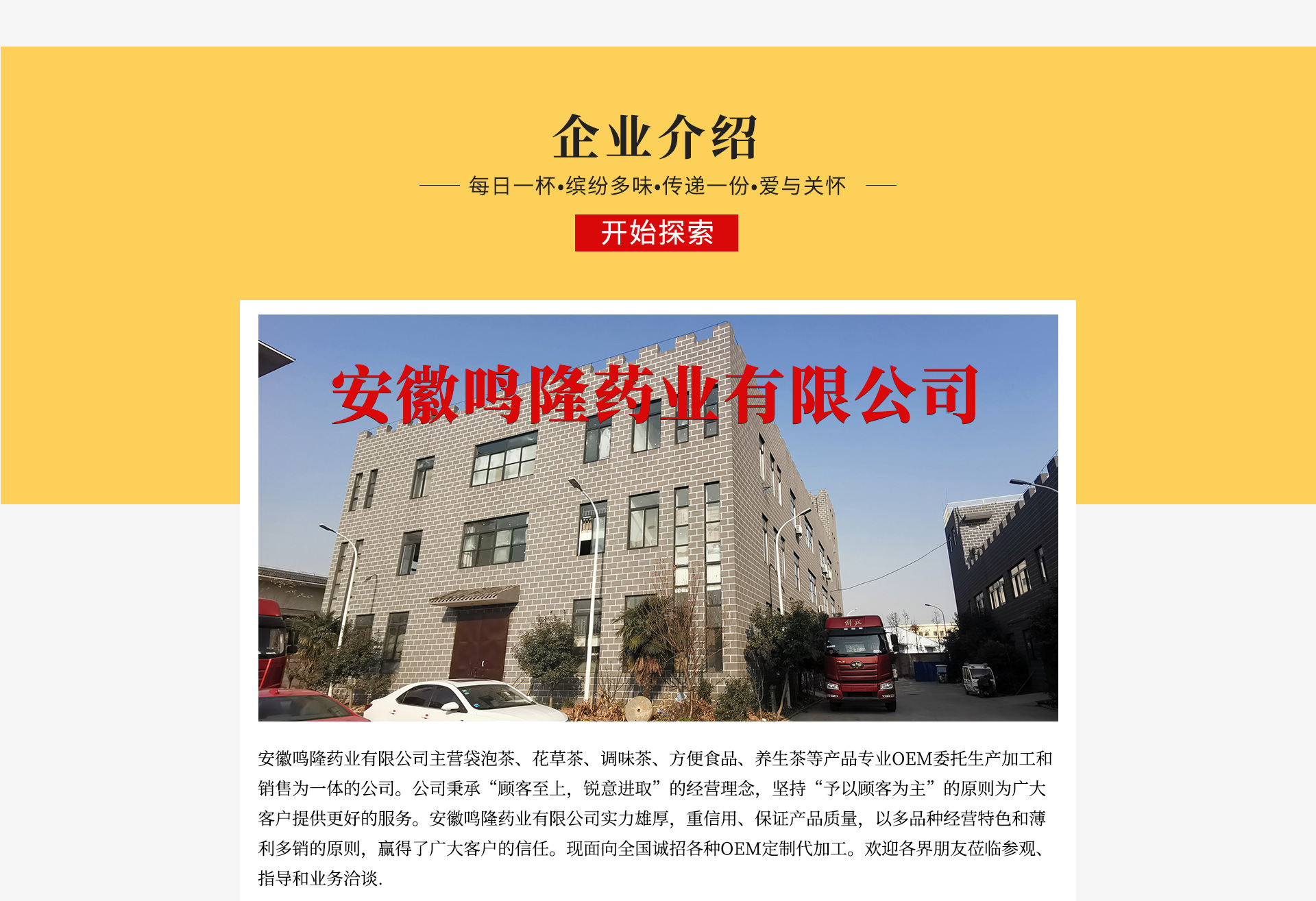 本公司主营、花草茶、调味茶、方便食品、养生膏滋、三角包等产品。专业OEM委托生产加工和销售为一体的公司。公司秉承“顾客至上,锐意进取”的经营理念,坚持“客户为先”的原则为广大客户提供服务。本公司实力雄厚,重信用、保证产品质量,以多品种经营特色和薄利多销的。赢得了广大客户的信任。现面向各地诚招各种OEM定制代加工。欢迎各界朋友莅临参观、指导和业务洽谈。