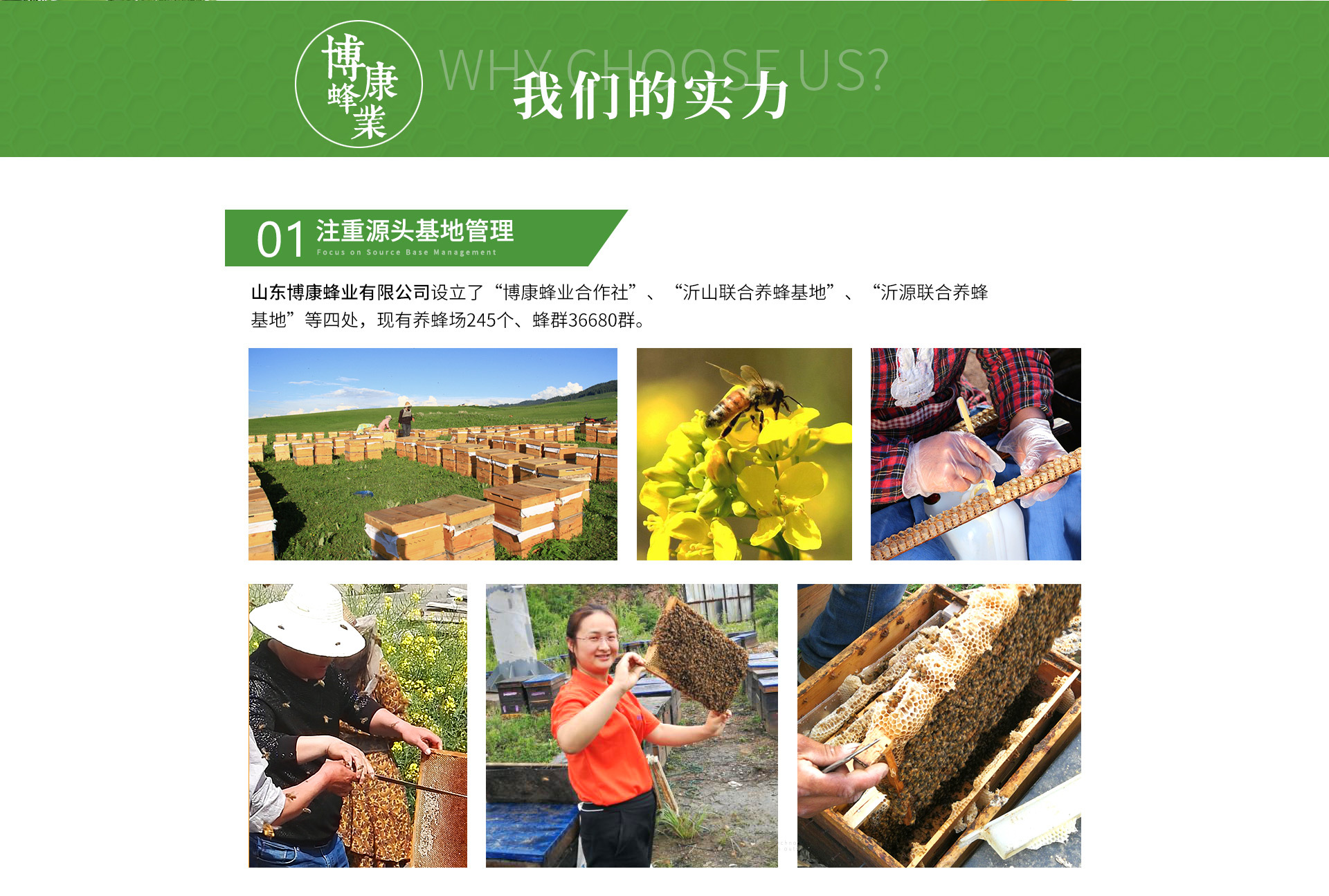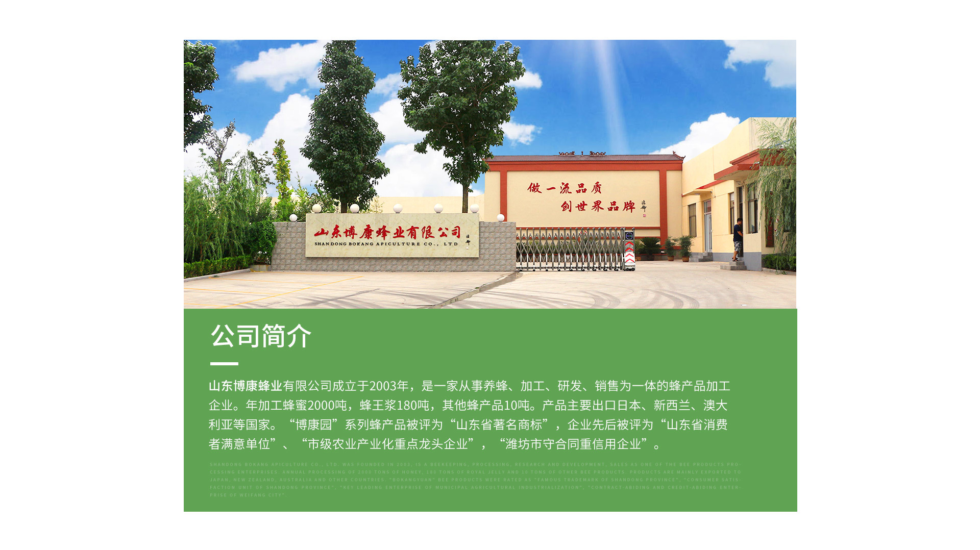 山东博康蜂业有限公司公司成立于2003年,座落于国家5A级森林公园-沂山脚下。专业从事养蜂、加工、研发、销售为一体的蜂产品加工企业。占地14790㎡,建有符合GMP要求的生产车间3024㎡,拥有专业技术人员32人,并成立了博康蜂业专业合作社 ,设有“沂山联合养蜂基地”,“沂源联合养蜂基地”,“鲁山自属养蜂基地”。现有养蜂场245个、蜂群36680群。年加工蜂蜜2000吨,年加工蜂王浆180吨,其他蜂产品(蜂花粉、蜂胶、蜂蜡、雄蜂蛹、王浆幼虫等)10吨,产品远销日、新西兰、澳大利亚等国家。  公司通过了SC认证;食品出口卫生认证;ISO9001:2015和HACCP质量体系认证及《采用国际标准产品标志证书》和《企业产品采用国际标准确认可证》,建立符合蜂产品检测要求的研发中心一处,为保证食品安全和产品质量提供了可靠保障,山东博康蜂业有限公司欢迎您来参观考察。