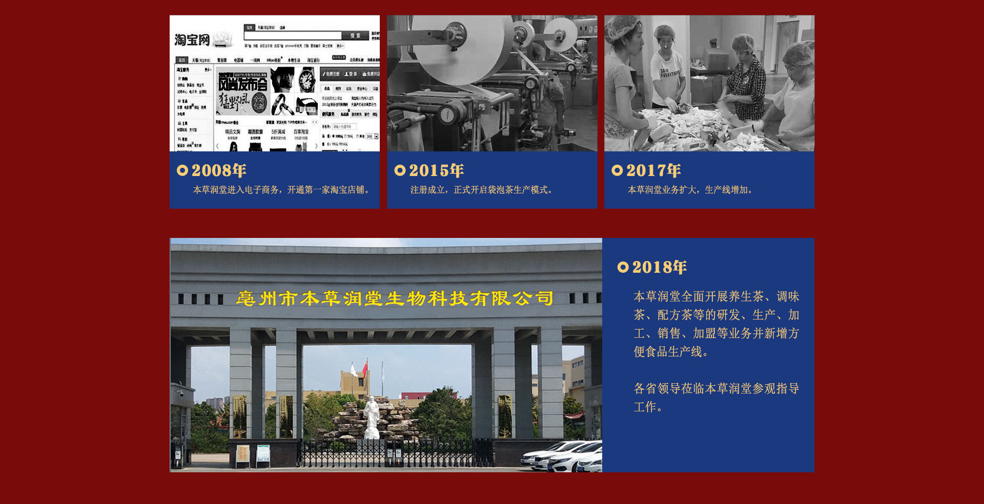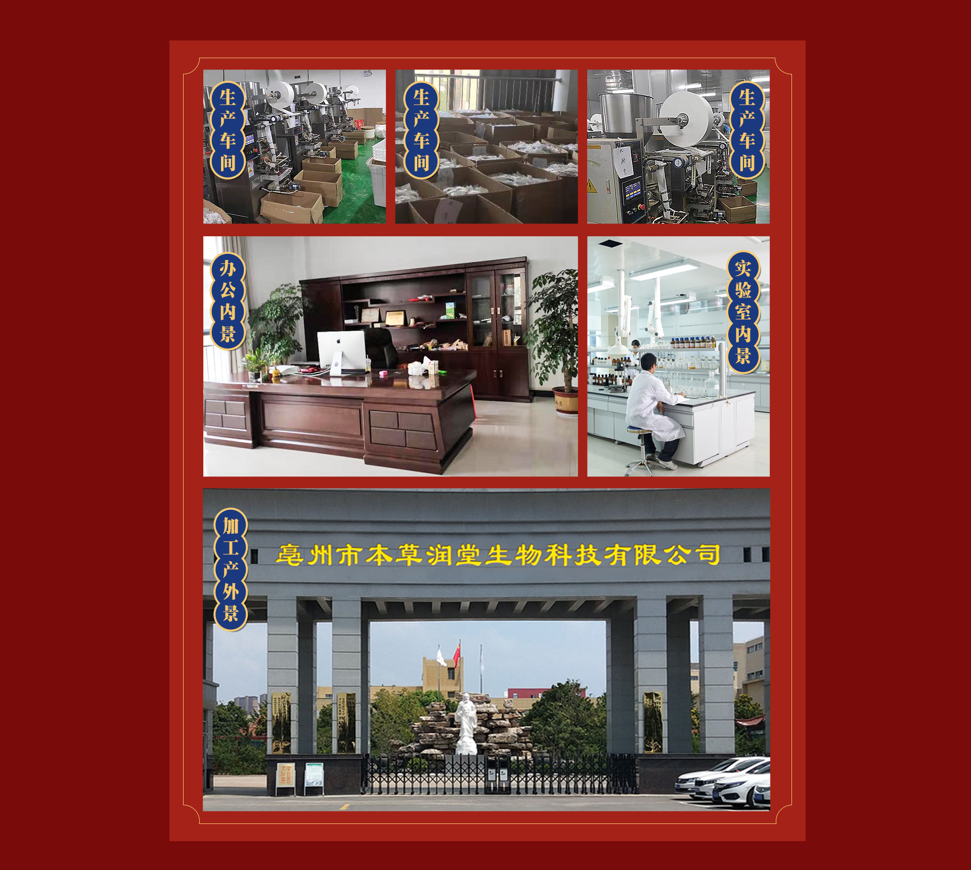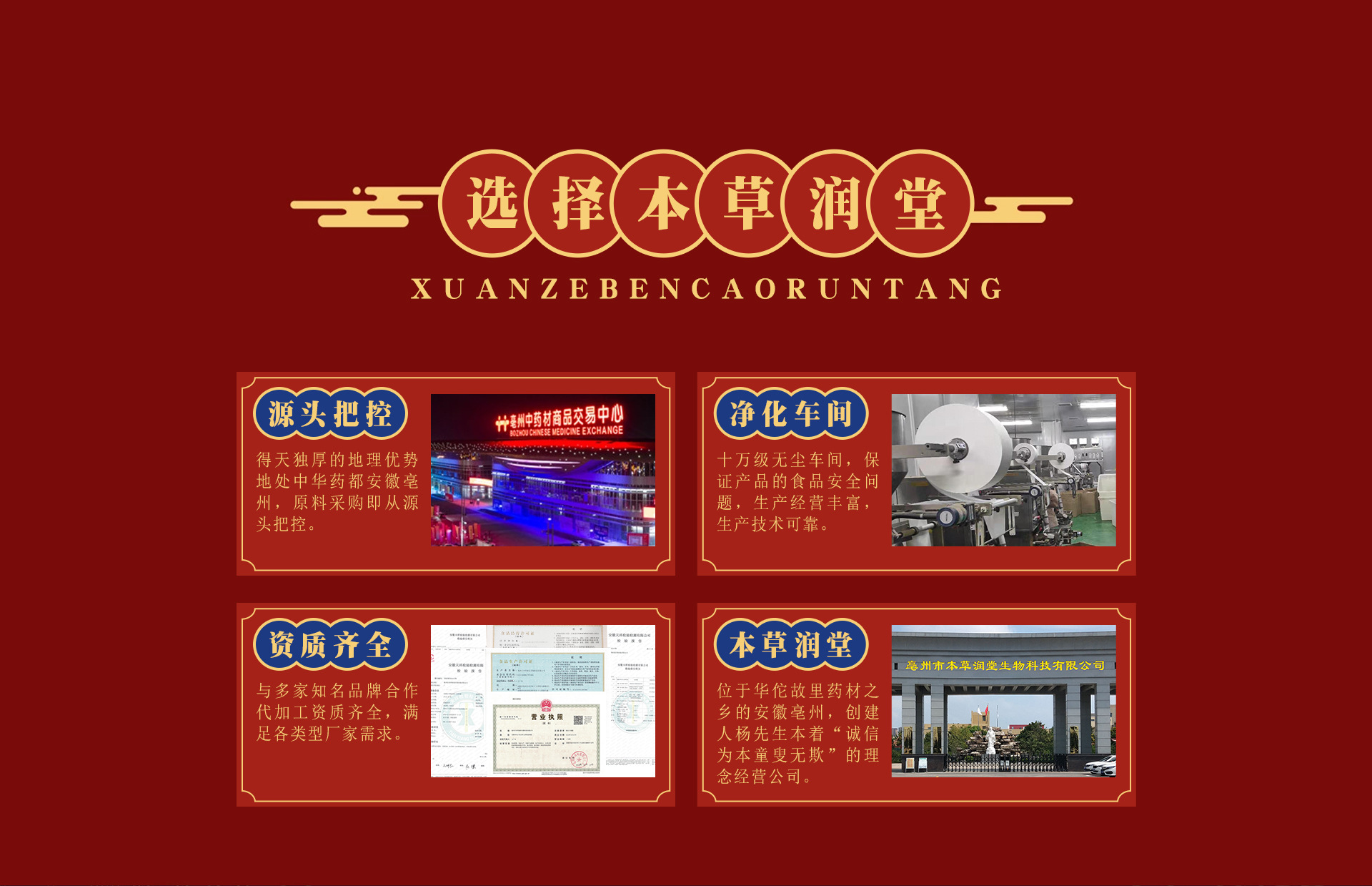 「亳州市本草润堂生物科技有限公司」始建于1928年,坐落于华佗故里药材之乡的安徽.亳州,创始人杨先生百年来,本着「诚信为本,童叟无欺」的经营宗旨造福于民。用料上更是采用道地原料,尊古炮制的原则。祖训「做良心道地的茶」。