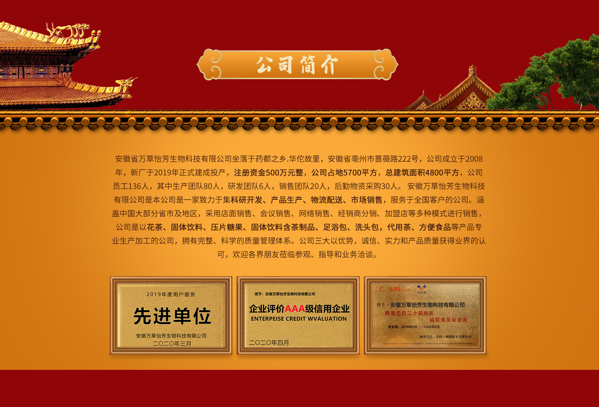 安徽万草怡芳生物科技有限公司坐落于华佗故里,中华药都安徽亳州。是代用茶、调味茶、花草茶、黑芝麻丸、压片糖果、固体饮料、膏滋、足浴包、洗头包、沐浴包。等产品专业生产加工的公司,公司资质、设备齐全。拥有得天独厚的历史文化传承以及完整、科学的质量管理体系。安徽万草怡芳生物科技有限公司的凭借三大优势;诚信、实力和产品质量获得业界的认可。欢迎各界朋友莅临参观、指导和业务洽谈。