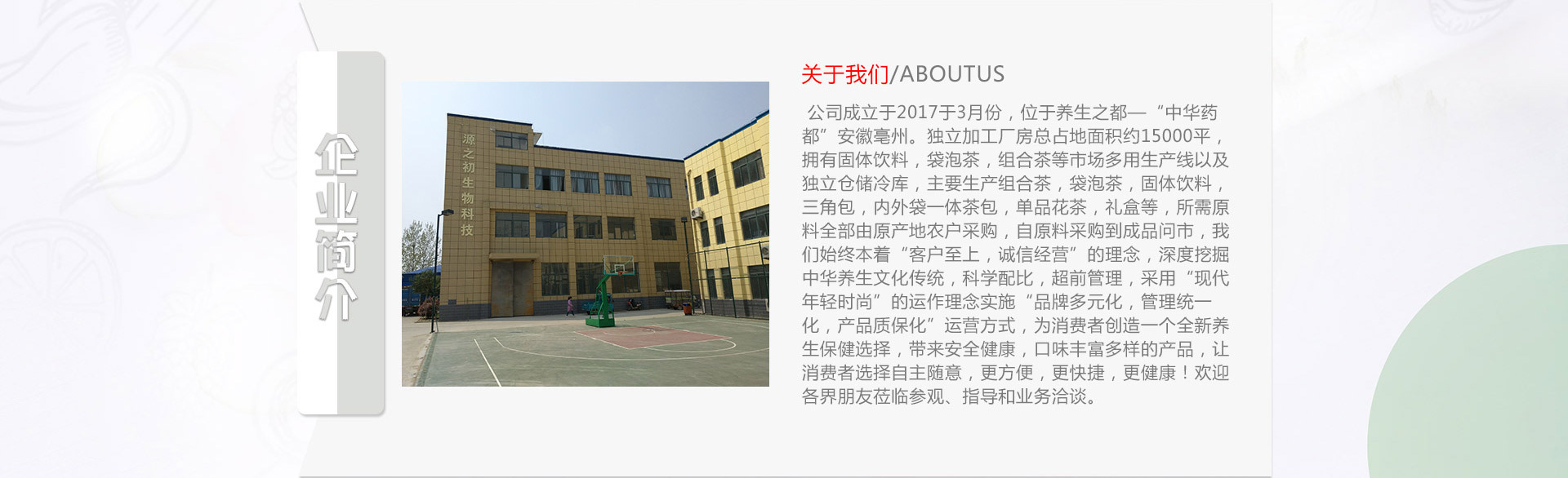 亳州源之初生物科技有限公司致力于养身茶,代用茶,固体饮料生产代加工,服务广大电商、药店、商超。