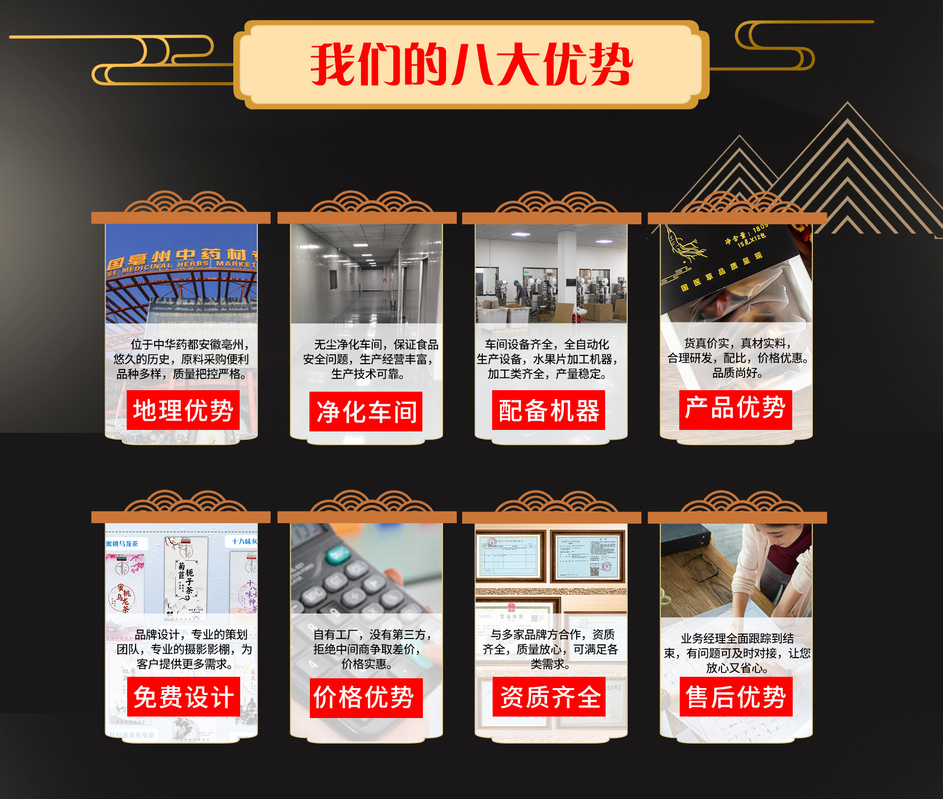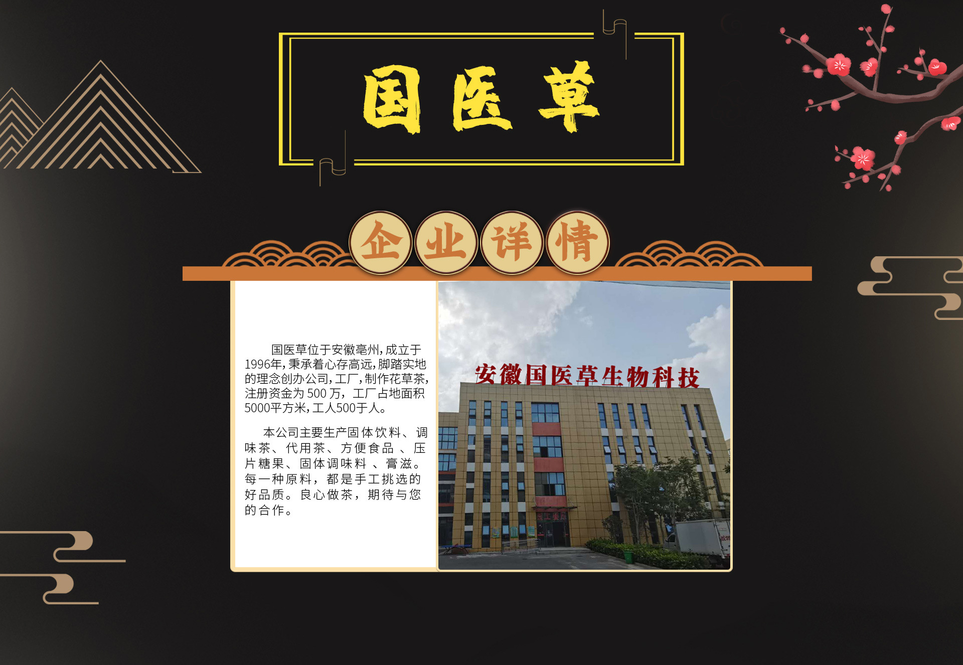 安徽国医草生物科技有限公司是花茶(袋泡茶.组合茶)、芝麻丸、膏滋、固体饮料、方便食品等产品专业生产加工的公司,拥有完整、科学的质量管理体系。安徽国医草生物科技有限公司的诚信、实力和产品质量获得业界的认可。欢迎各界朋友莅临参观、指导和业务洽谈。