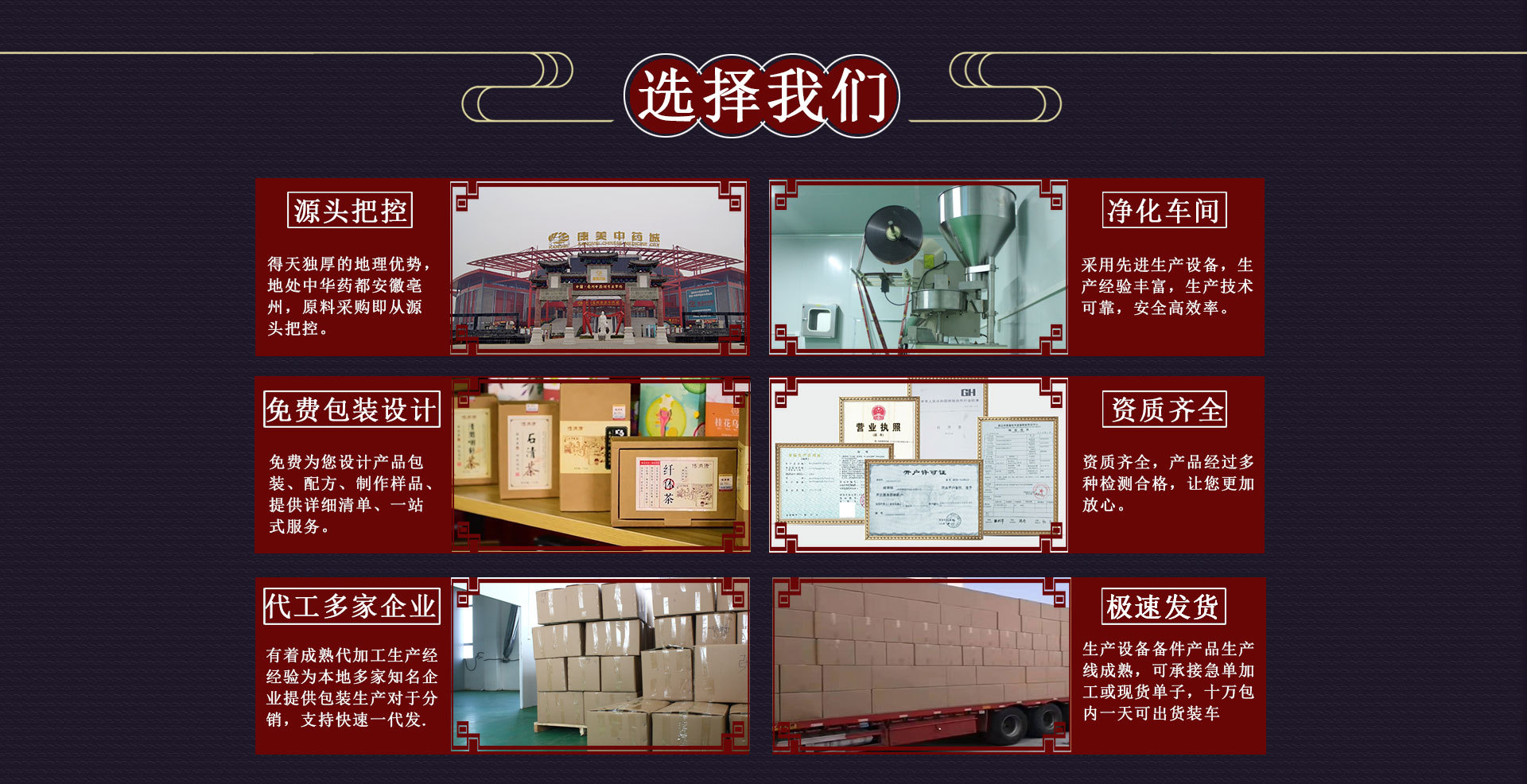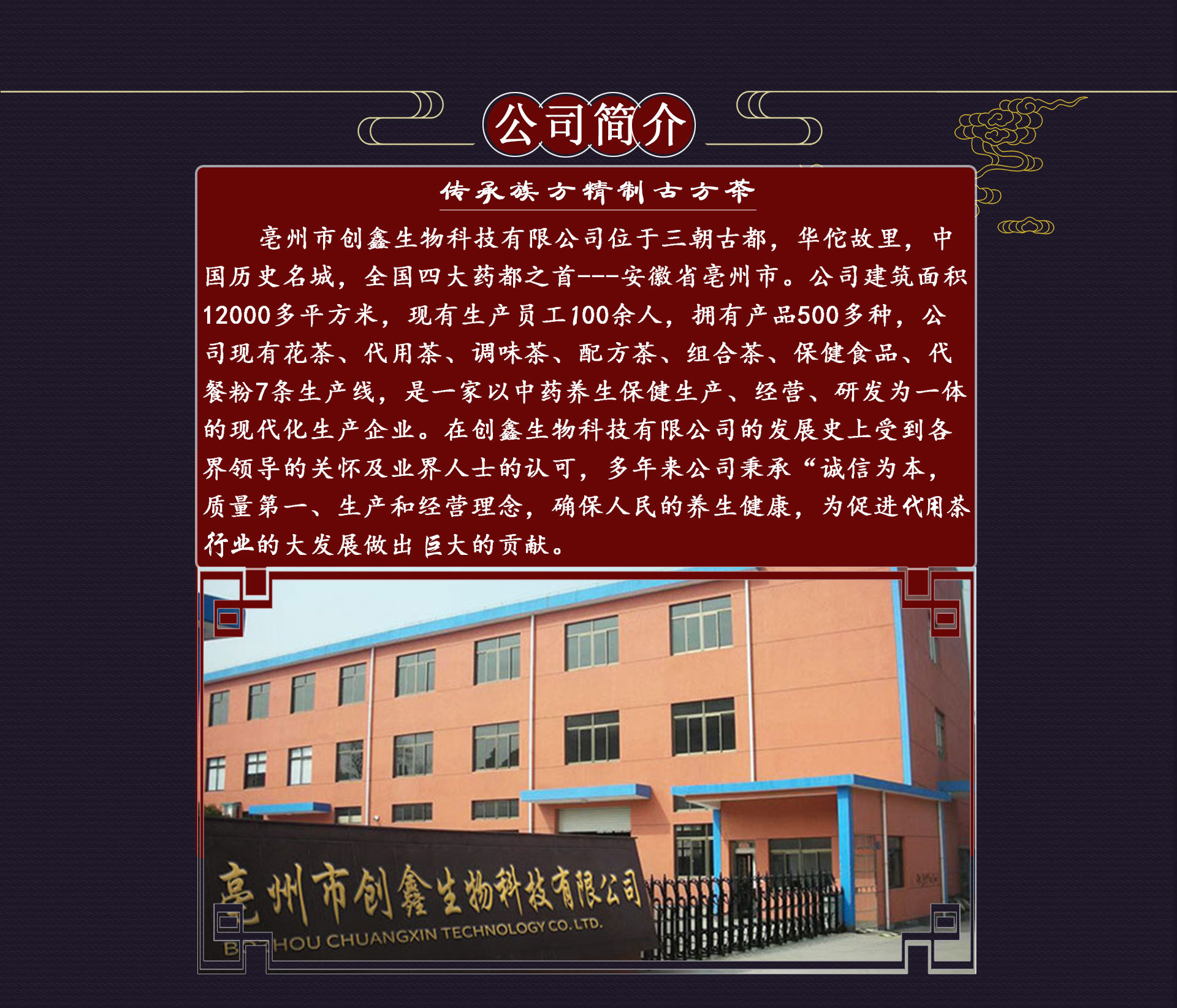 亳州市创鑫生物科技有限公司位于三朝古都,华佗故里,中国历史文化名城,全国四大药都之首---安徽省亳州市。公司建有花茶、代用茶、调味茶、配方茶、组合茶、保健食品、代餐粉7条生产线,是一家以中药养生保健生产、经营、研发为一体的现代化企业。多年来公司秉承‘’诚信为本,质量第一‘’的经营理念,确保人民用养生健康,为促进养生保健打发展做出更大贡献。