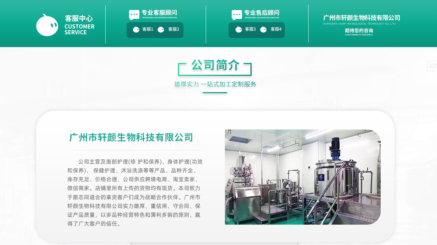 广州市轩颜生物科技有限公司是一家集研发、实验、生产为一体的专业化妆品企业,是一家从事化妆品研发、生产、销售、服务、OEM/ODM/OBM于一体的专业化的大型加工工厂,帝属于广州宸极生物科技旗下公司,硬件优势 ?1、生产环境:十万级无尘净化车间,万级理化实验室。2、生产设备:全新设备及最新的面膜机等。3、产品原料:全球十强原料供应商指定供应。4、新产品研发:专业化的工程师团队。5、生产质量:万级的理化实验室,来料检验、半成品及成品检验、第三方检验。