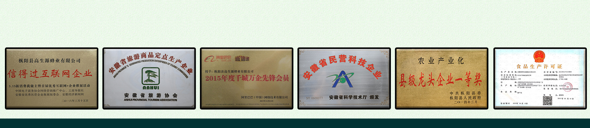 安徽省高生源蜂业有限公司企业简介: 高生源蜂业蜂业有限公司位于池州市,整个城市环境优美,无化工生产企业,无污染;毗邻长江青山绿水,非常适宜设置食品生产企业加工生产,公司主产“高生源”牌蜂蜜、蜂王浆、蜂花粉等系列产品,拥有自主知识产权的蜜蜂养殖基地,蜂产品开发等专业技术的枞阳县蜜蜂科学研究所;公司依托研究所拥有公司加农户加基地的经验模式,滚动式发展,目前公司已发展重点养蜂户300户,蜂群15000箱,年蜂蜜产量达350吨,蜂王浆10吨,花粉8吨,蜂胶1吨,产品完全走产供销一体化之路,销往全国各地,以优良的产品质量,优质的服务,奉献给广大客户。 高生源品牌先后荣获安徽省民营科技企业,安徽省旅游商品定点生产企业,安庆市知名商标,并荣获2014年县级龙头企业一等奖,2015年获得市级龙头企业称号,2016年获得315颁发的互联网信得过企业。