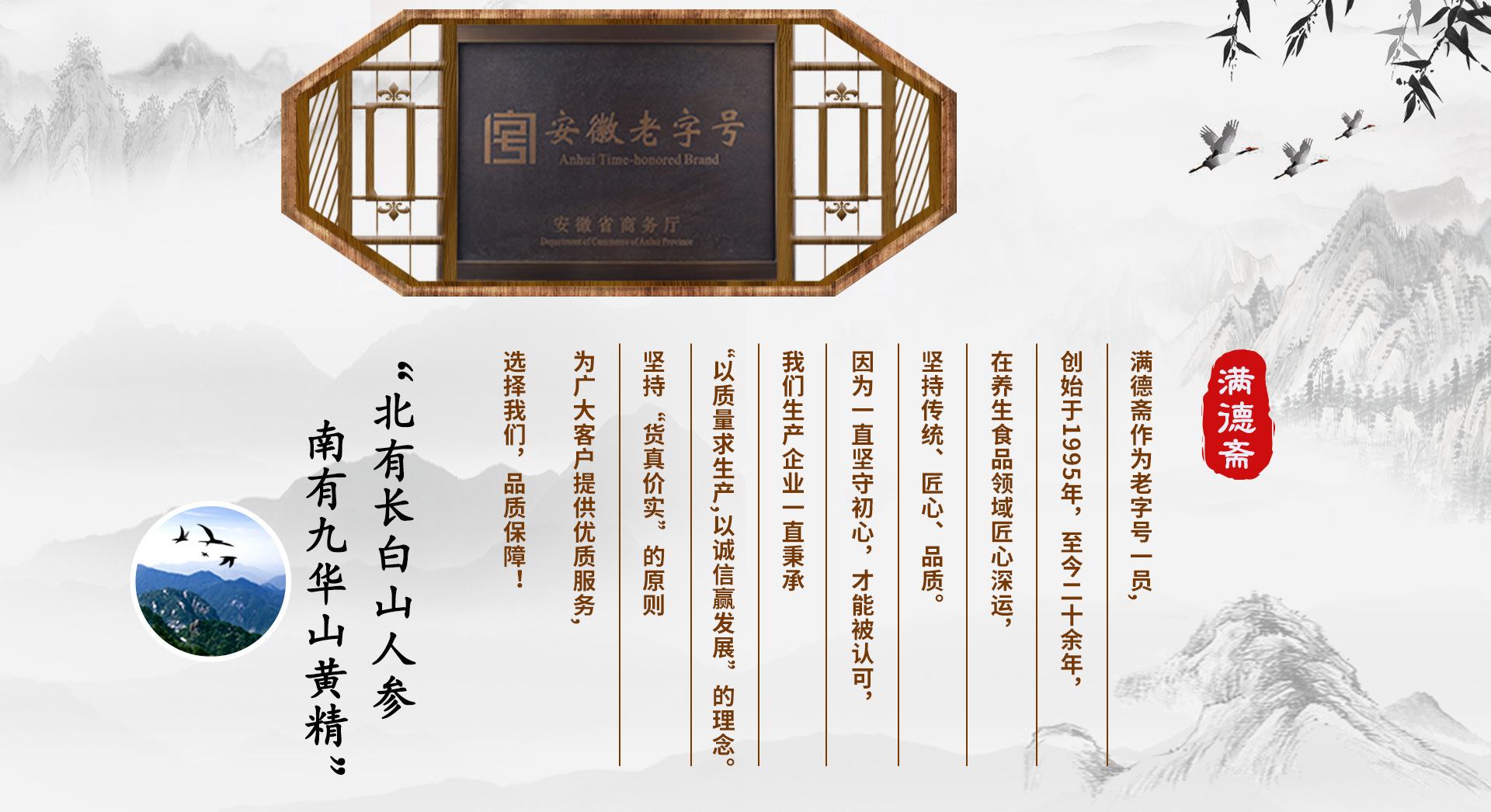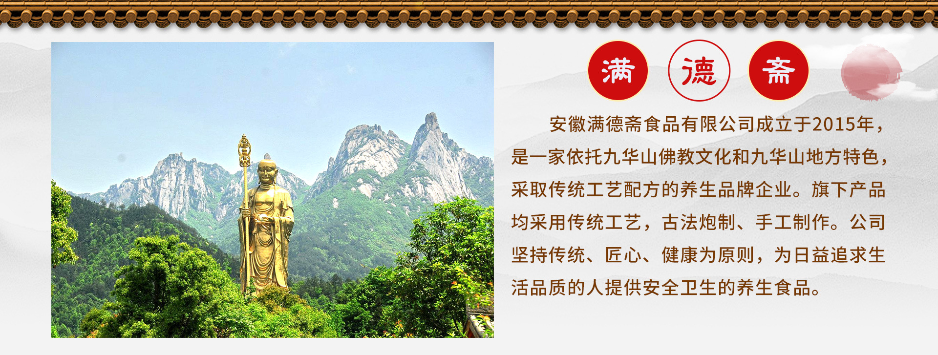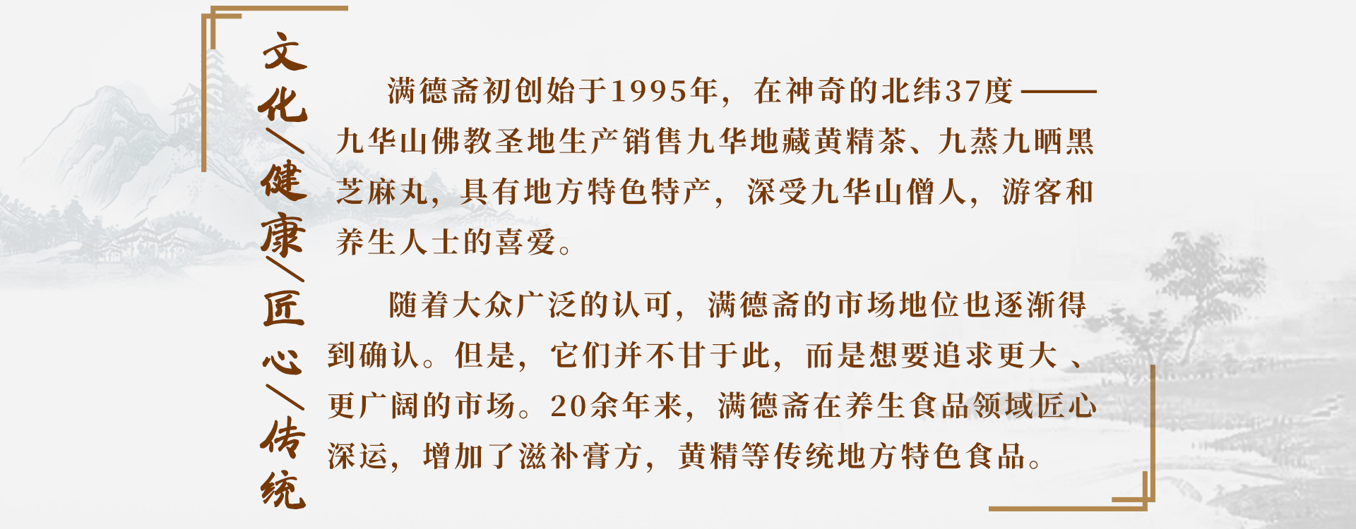 安徽满德斋食品有限公司,安徽老字号企业。主营九蒸九晒芝麻丸、红豆薏米丸、九蒸九晒黄精、柠檬膏、姜糖膏、桑葚膏、四物膏、八珍膏等滋补膏等。安徽满德斋食品有限公司成立与2015年,注册资本1000万,是一家专业从事黄精种植、加工、销售、研发的企业。满德斋积极传承古法九蒸九晒工艺,专注于古法养生领域。互联网+农业+工厂实现产销一体化。产品销往全国各地深受好评。公司秉承“以质量求生存; 以诚信赢发展”的经营理念,坚持“货真价实”的原则为广大客户提供优质的服务。欢迎惠顾!