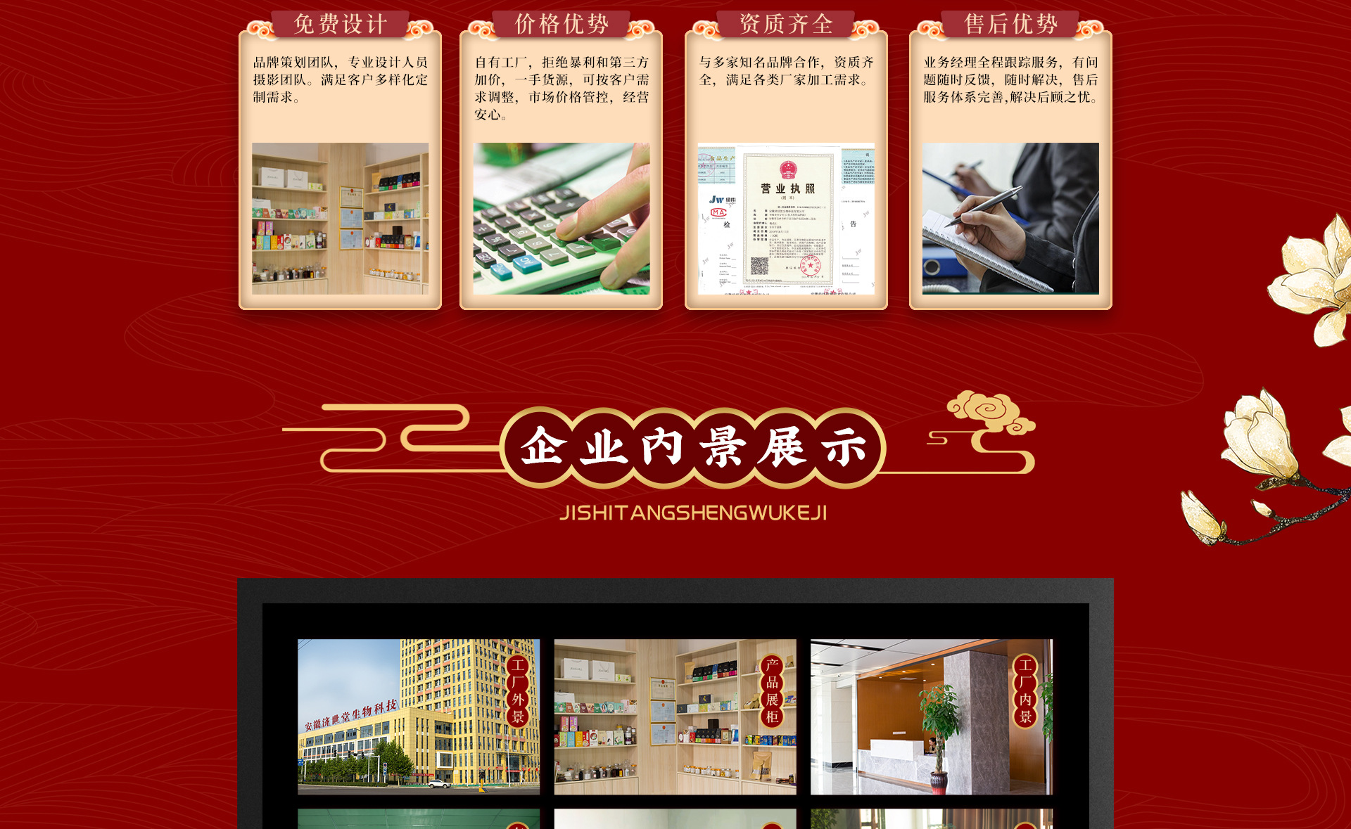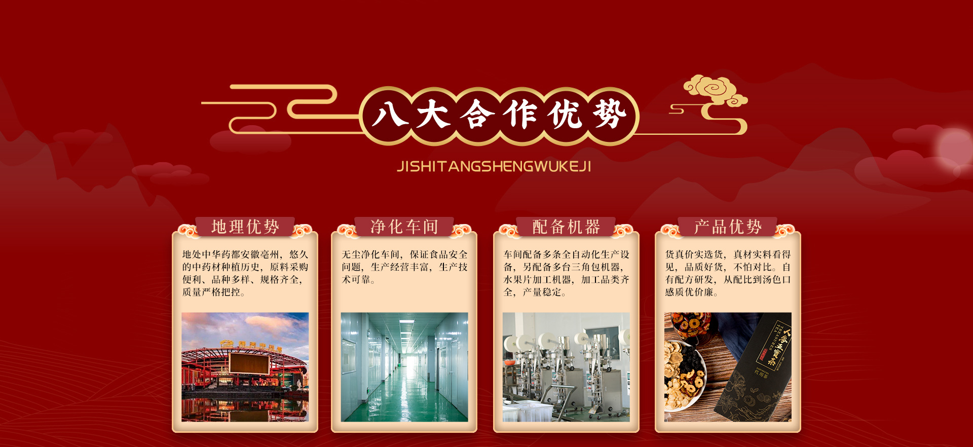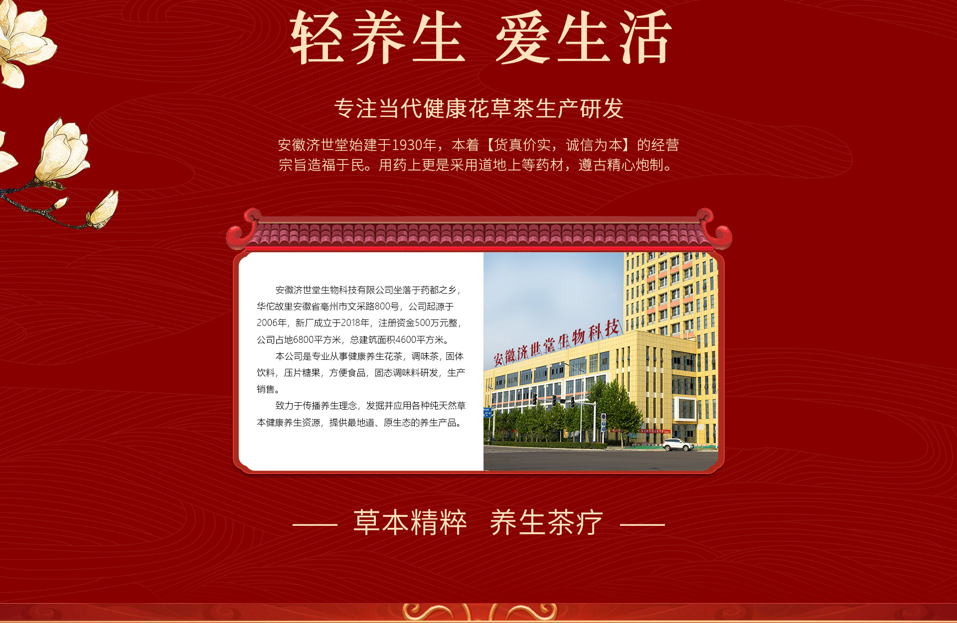 安徽济世堂生物科技有限公司是一家专业从事新型纯天然健康养生花茶研发、生产、销售和服务于一体的专业标牌生产厂家,致力于传播养生理念,发掘并应用各种纯天然草本健康养生资源,提供最地道、原生态的养生产品。安徽广和堂药业有限公司秉承“草本精粹,养生茶疗”理念,坚持以尖端科技诠释经典古方,旗下所有产品均遵循传统医学之精髓,根据不同病症有针对性选用各种天然草本药材配制,并经现代生物技术加工而成,易于服用的养生茶。在改善体质,治理疑难疾病、慢性病,预防重大疾病方面有独特优势。在产品质量管控上,安徽广和堂药业有限公司始终坚持绿色天然、无任何添加的原则,与10多个原产地供应商形成深入合作关系,从源头上保障产品的完美品质,现在已建立相对成熟稳定的原料供应链,实现产供销一体化。