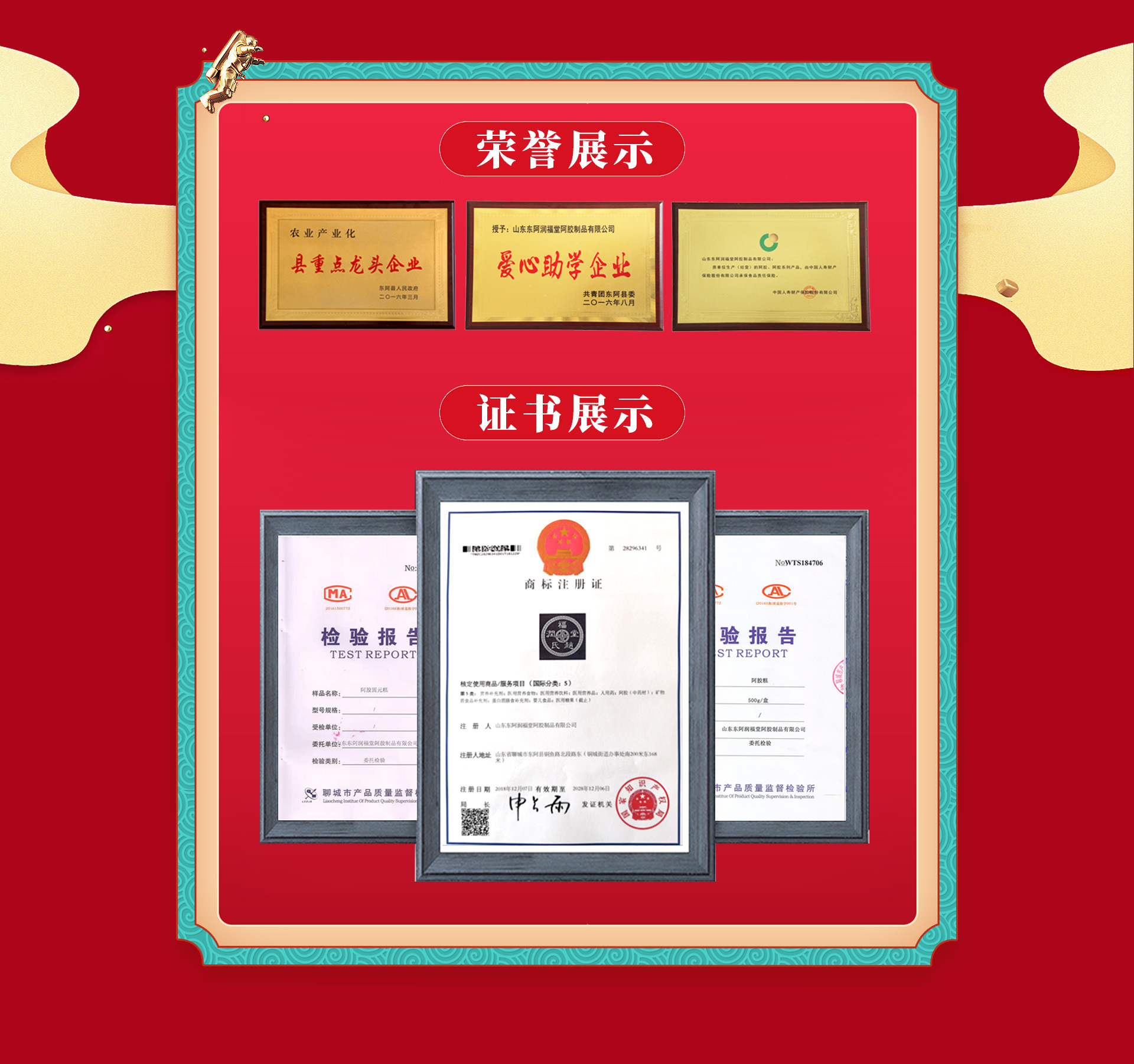 润福堂阿胶 公司创建于2014年,坐落于山东省东阿县,是一家集阿胶系列及代用茶、糖制品等产品的研发、生产、销售为一体的现代化企业。 目前公司经营的产品有“阿胶片、阿胶糕、阿胶固元糕、阿胶速溶粉、各种花茶代用茶、各类糖制品等,公司采用传统生产工艺,结合现代生产技术为广大客户提供优质健康产品。 公司润福堂阿胶制作技艺为县非物质文化遗产、公司被授予为“县农业产业化龙头企业”、“捐资助学爱心企业”等一系列荣誉称号,公司为县保健品行业协会会员单位。 "诚信经营、合作共赢”一直是公司经营理念,公司不断加强新品开发,面向全国招商!