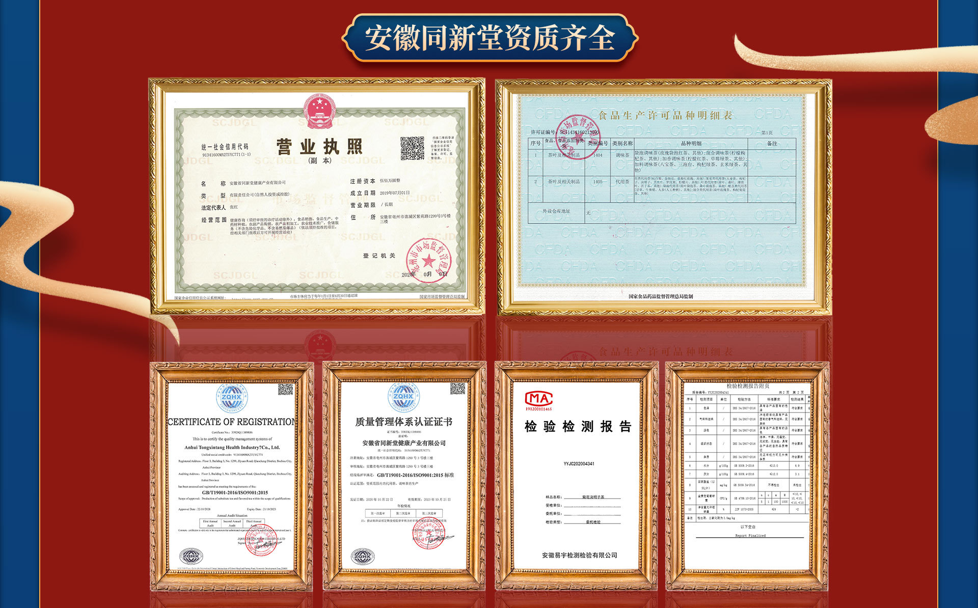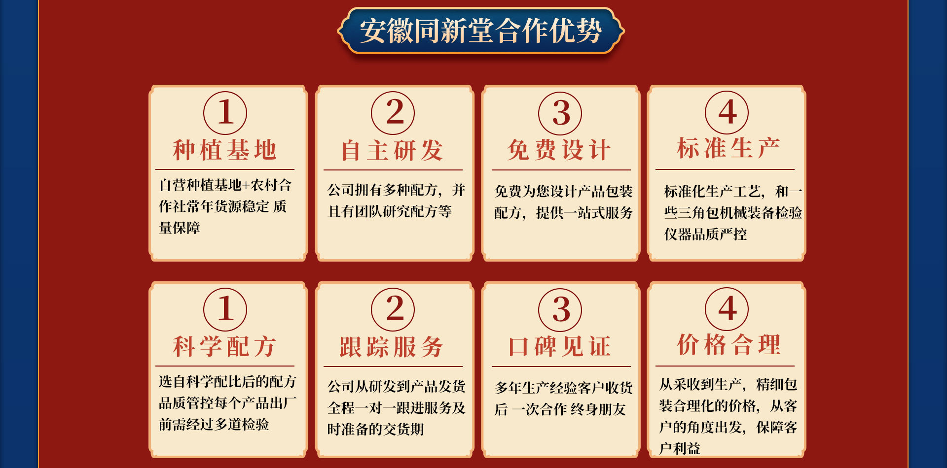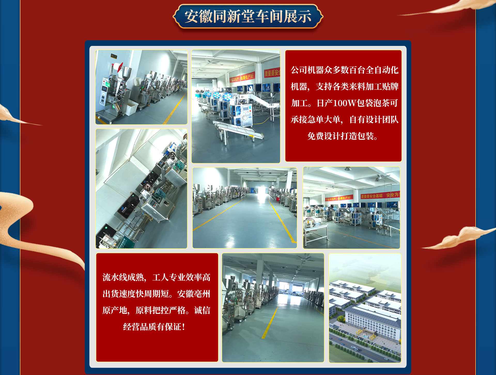 安徽省同新堂健康产业有限公司是代用茶、袋泡茶、花草茶等产品专业生产加工的公司,拥有完整、科学的质量管理体系。安徽涵鹭药业有限公司的诚信、实力和产品质量获得业界的认可。欢迎各界朋友莅临参观、指导和业务洽谈。现面向全国诚招各种OEM定制代加工