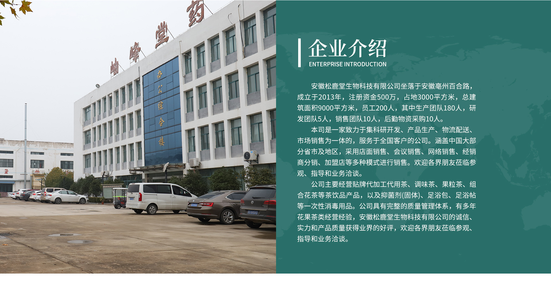 安徽松鹿堂生物科技有限公司成立于2019年,主要经营各类花草茶、膏滋、代餐粉、代餐粥、足浴包、压片糖果等。员工总数100人,研发人员2名。厂房面积2500平方米。