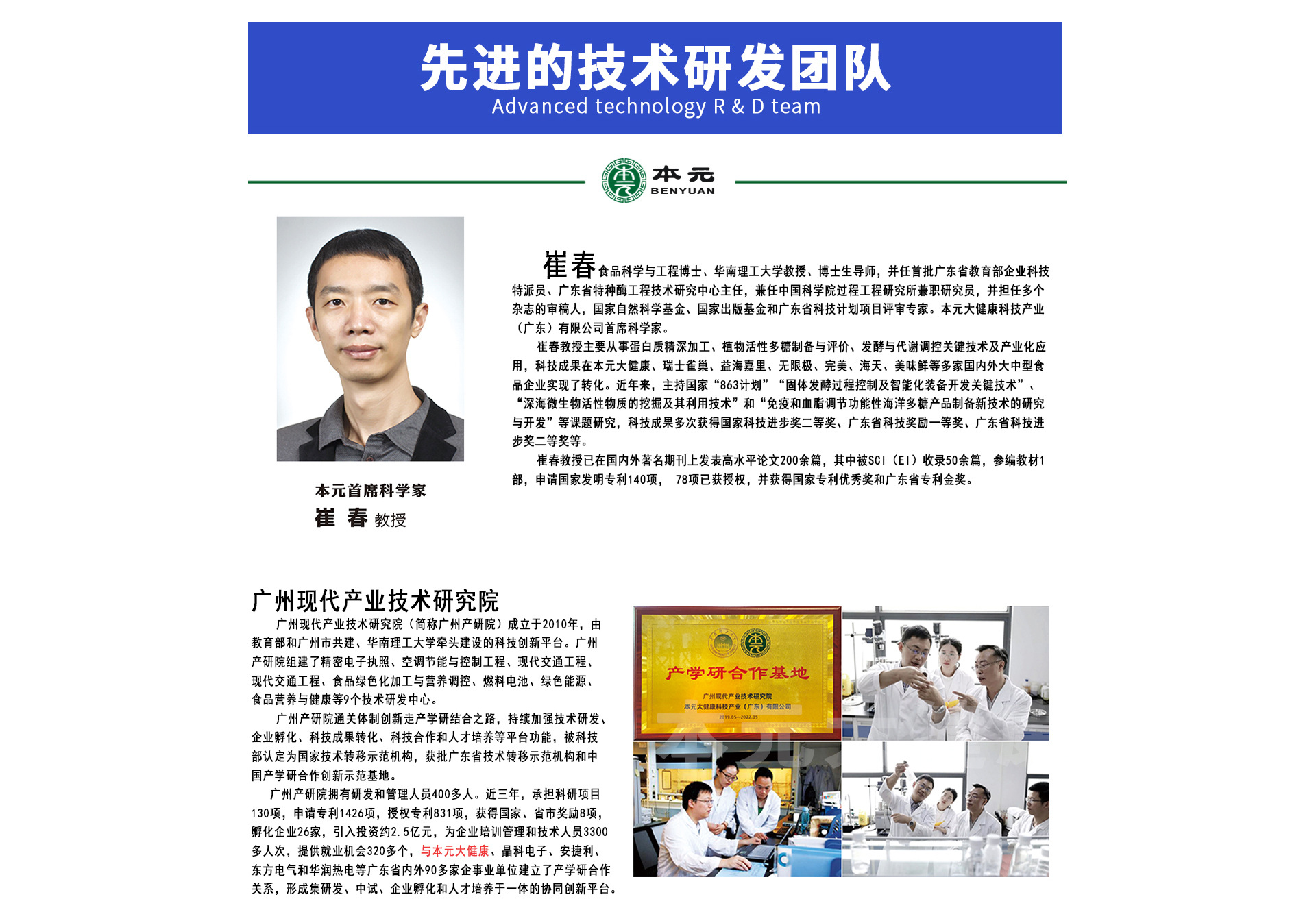 本元大健康科技产业(广东)有限公司(简称:本元大健康)位于广东省河源市高新技术开发区科技八路1号,占地面积37000余平方米,生产办公仓储面积20000余方,是一家专业从事功能性饮品、膏滋和果冻的研发、生产、销售的现代化技术企业。 本公司拥有药学、食品工程及相关专业工程师25人,特聘专家6人,专业销售人员30余人,专业生产技术工人近100人,可专业为客户设计、优化产品配方,并可按客户要求定制产品,全力助合作伙伴事业腾飞!