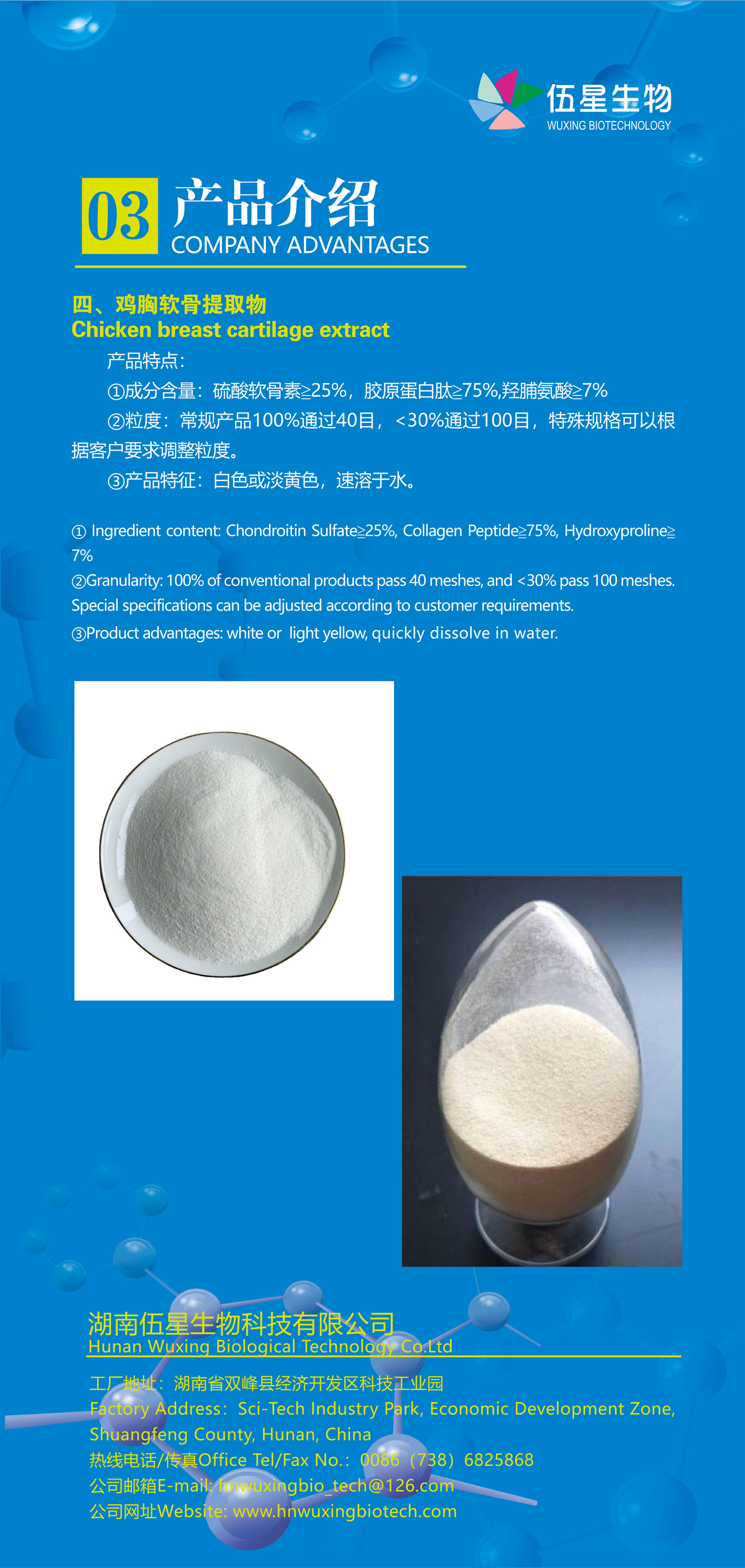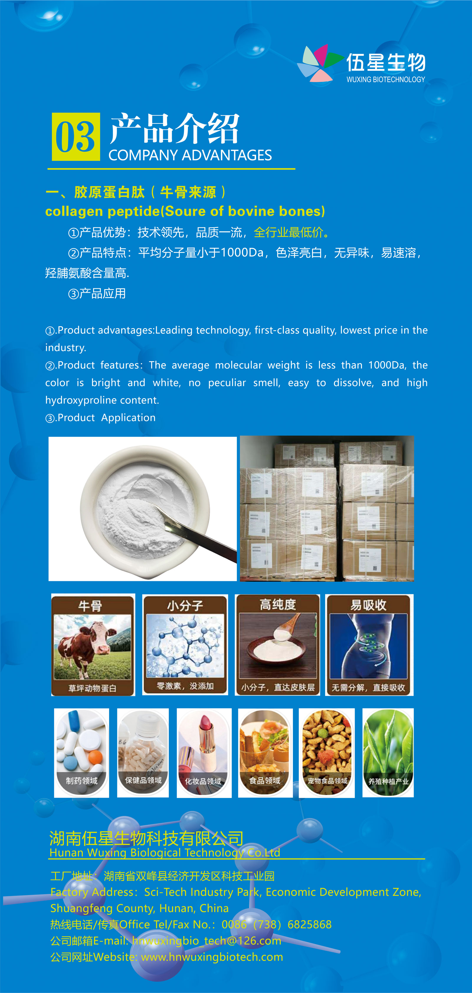 湖南伍星生物科技有限公司是一家生物制品的高新技术企业。公司自组建成立以来,秉承“以科技为先导、以创新求发展、以质量求生存、以诚信待客户”的企业精神,实行“专业追求、行业领先、创新发展、永不止步”的经营理念,贯彻国家现阶段大力支持健康产业发展的宏观政策,以实现经济效益与社会效益的双重提高为目标,公司全体员工勤勉敬业,拼搏进取,在促进胶原蛋白肽和硫酸软骨素制造业健康发展、推动其产业技术革新方面做出了突出的贡献。多年以来,我公司承担科技部、省科技厅创新攻关项目十余项,培养了一大批专业技术人才,填补了行业多项国内空白,现拥有授权发明专利5项,获得了硫酸软骨素钠药品生产许可证,硫酸软骨素(钠)保健食品生产许可证,胶原蛋白肽粉食品生产许可证,通过了美国NSF认证、清真认证、ISO22000:2005食品安全管理体系认证、ISO14001:2015环境管理体系认证。