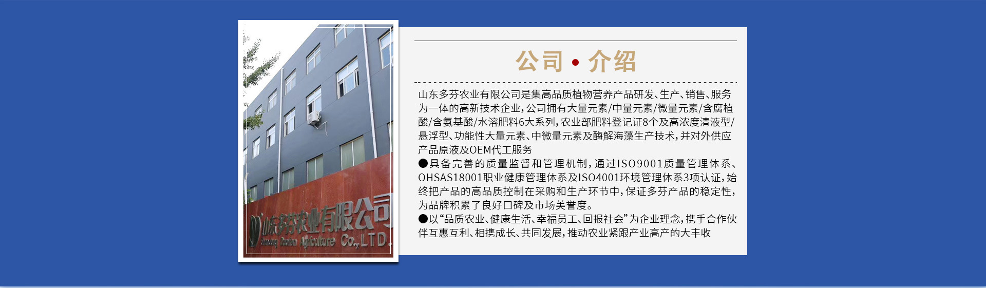 山东多芬农业有限公司是从事新型肥料研发、生产、销售、服务为一体的高新技术企业,专注于液体肥原液生产,证件齐全。主导业务为大型农化企业提供流体肥原液及OEM代工服务,坚持以“品质农业,健康生活”为企业理念