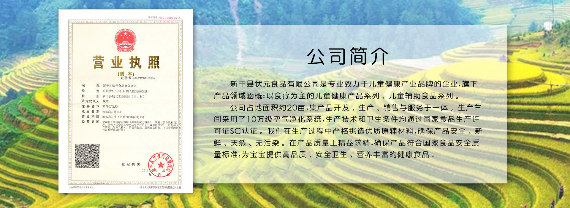 新干状元食品有限公司是一家通过“GMP”和“QS”认证企业,多年以来致力于以母婴营养食品为主的研究、生产销售。公司本着“孕育未来,妈妈呵护,宝宝健康”的宗旨,以多个品牌为核心,以市场为主体,实现共赢的经营理论。针对宝宝不同年龄段的生长发育要求,生产了“味滋肴”“才星状元”“迪米熊”等品牌。我司为源头工厂,支持OEM加工!