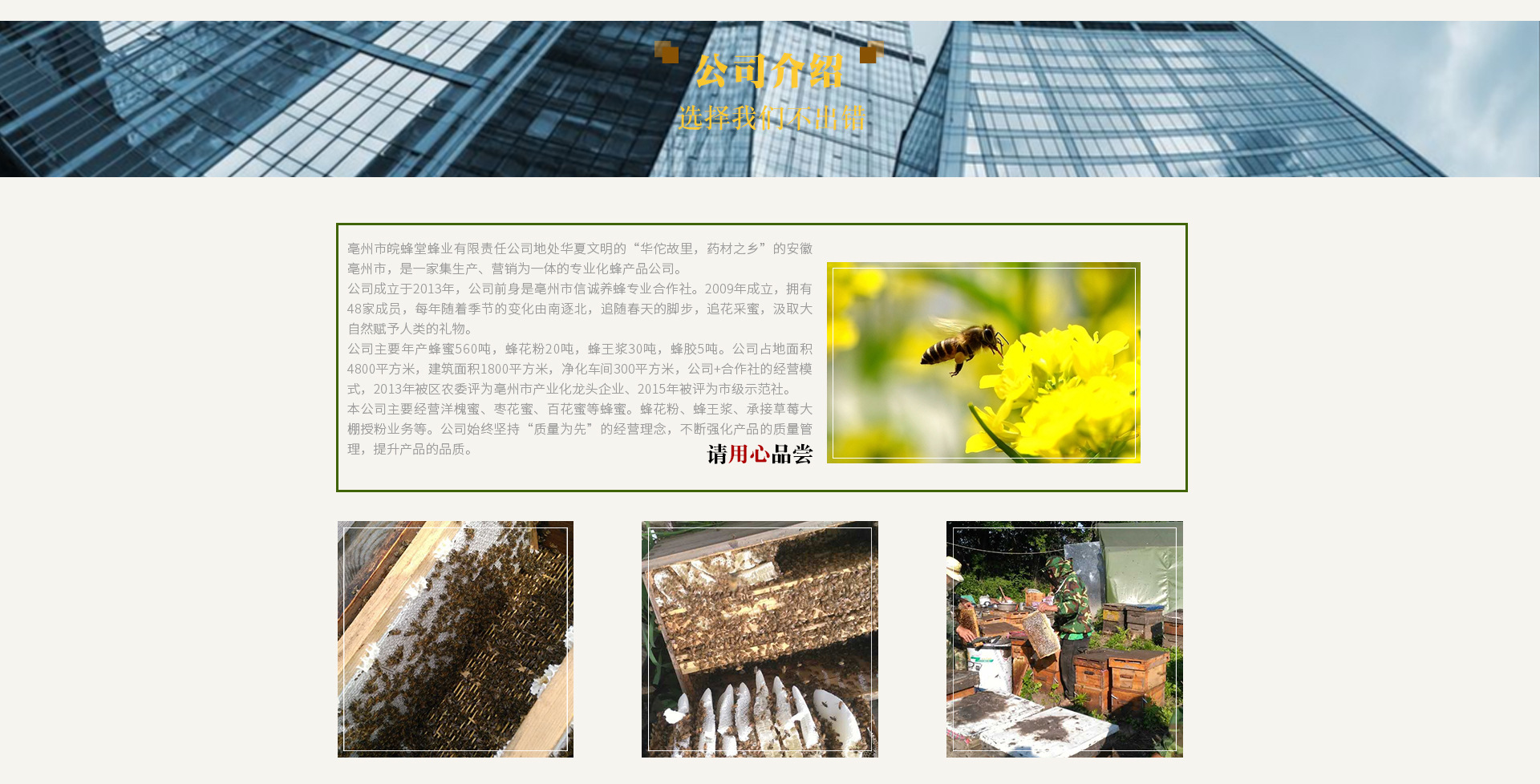 亳州市皖蜂堂蜂业有限责任公司位于三朝古都,华佗故里,中国历史文化名城,安徽省亳州市。亳州市皖蜂堂蜂业有限责任公司是蜂蜜,蜂蜜制品,为主的生产加工批发零售企业。产品畅销消费者市场,在消费者当中享有较高的地位,公司与多家零售商和代理商建立了长期稳定的合作关系。拥有完整、科学的质量管理体系。亳州市皖蜂堂蜂业有限责任公司的诚信、实力和产品质量获得业界的认可。欢迎各界朋友莅临参观、指导和业务洽谈。