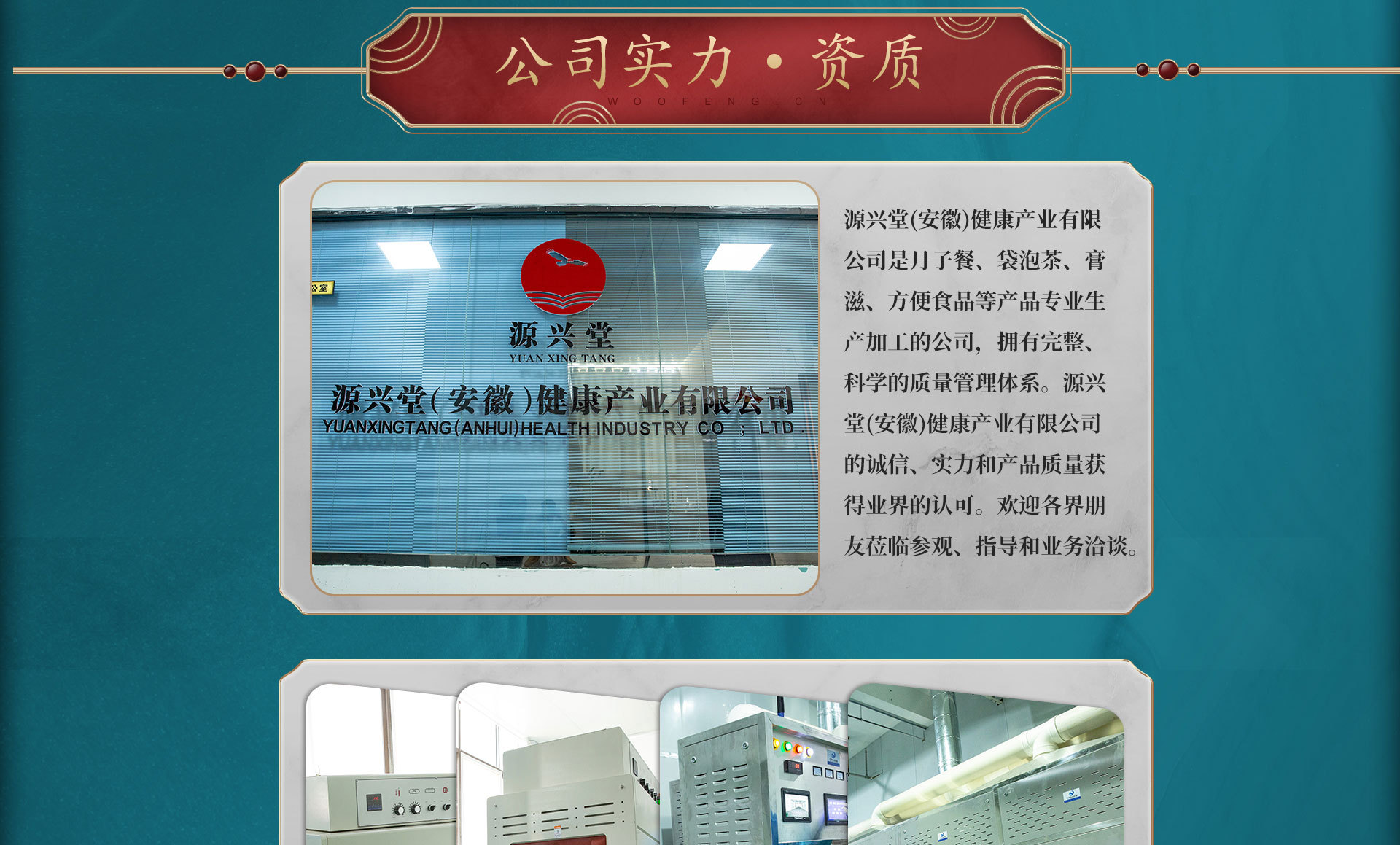 源兴堂(安徽)健康产业有限公司是月子餐、袋泡茶、膏滋、方便食品等产品专业生产加工的公司,拥有完整、科学的质量管理体系。源兴堂(安徽)健康产业有限公司的诚信、实力和产品质量获得业界的认可。欢迎各界朋友莅临参观、指导和业务洽谈。