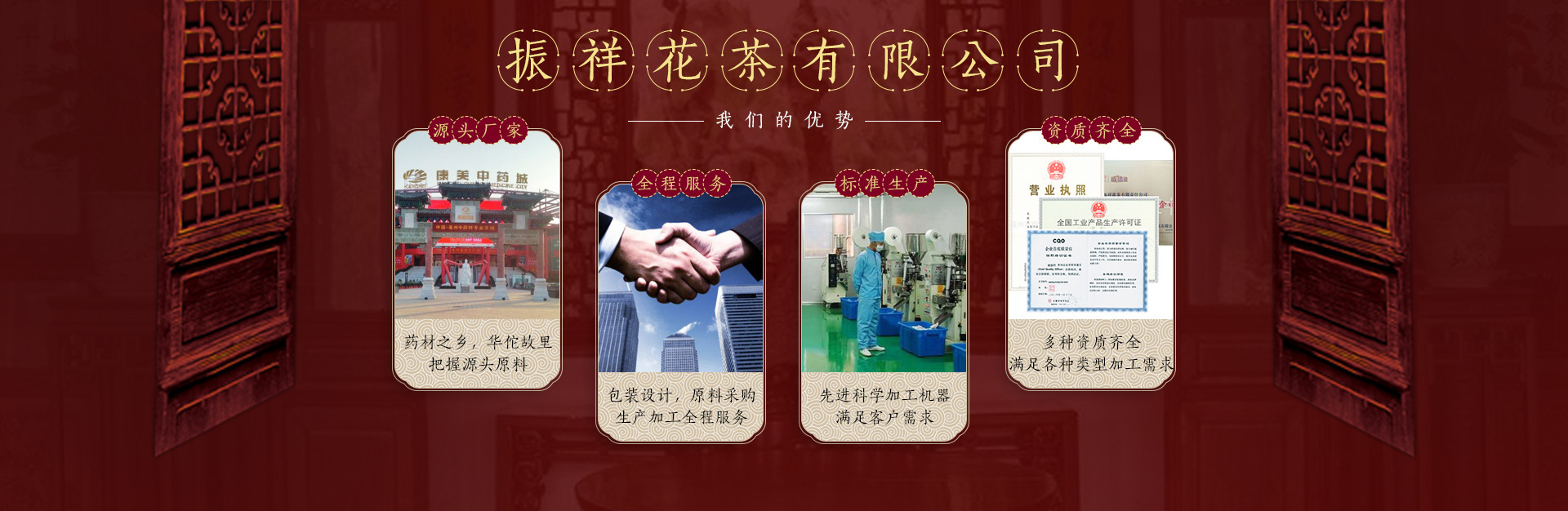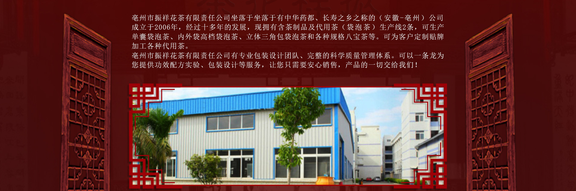 亳州市振祥花茶有限责任公司坐落于坐落于有中华药都、长寿之乡 之称的亳州市(安徽省亳州市经济开发区双创产业园) 公司成立于2013年,经过多年的发展,现拥有含茶制品及代用茶(袋泡茶)、方便食品、固体饮料、糕点等、生产线6条,可生产单囊袋泡茶、内外袋高档袋泡茶、立体三角包袋泡茶、红豆薏米粉、红糖姜茶和各种规格八宝茶等。 亳州市振祥花茶有限责任公司有专业包装设计团队。可以一条龙为您提供功效配方实验、袋泡茶加工、代用茶加工、包装设计等服务,让您只需要安心销售,产品的一切交给我们! 我公司加工产品可提供完整的SC生产许可资质、执行标准。在专注研发生产的同时,我公司为全球几百家中小企业提供了科技研发、生产加工、销售和授权等一系列的优质服务。亳州市振祥花茶有限责任公司的诚信、实力和产品质量获得业界的认可。欢迎各界朋友莅临参观、指导和业务洽谈。
