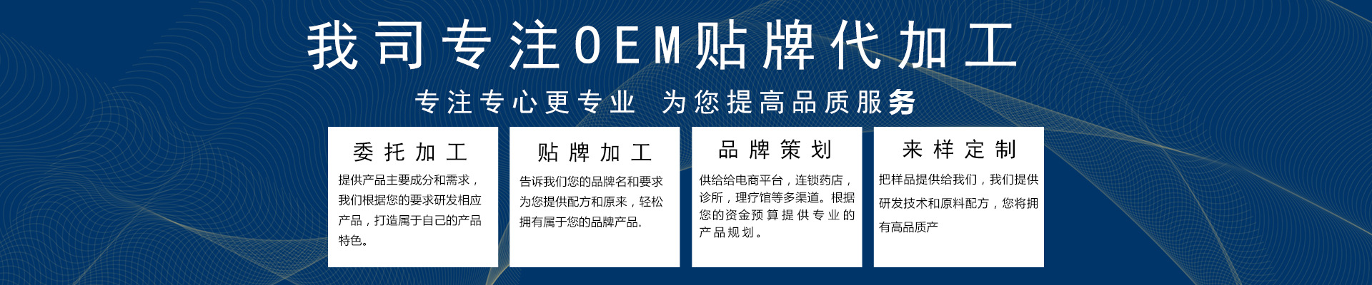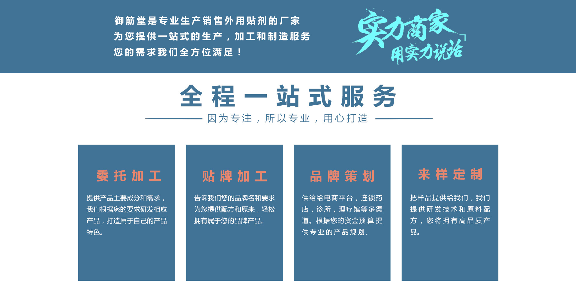 安徽御筋堂药业有限公司是一家集医疗器械,膏药贴加工、中药药包,药酒、内服产品等研发,生产,销售于一体的企业集团并已经形成多元化现代特色中医药产业集群。公司现有高水平生产设备进行不间断流水作业,持有各类正规批准文号,有自主品牌产品,黑膏药贴牌代理面向国内外、可膏药加工贴牌。有自己专业创新科研队伍秉承“质量为首、客户服务、诚信合作”为核心,在传统医药文化基础上,不断挖掘民间传统验方,结合高新技术生产工艺,生产出拥有自主知识产权的各种新产品严谨的工作作风与诚信的合作态度是我们的原则,与新老客户长期、稳定、不断增长的收益是对我们的肯定,能为人类健康作出贡献是我们持续不变的目标!