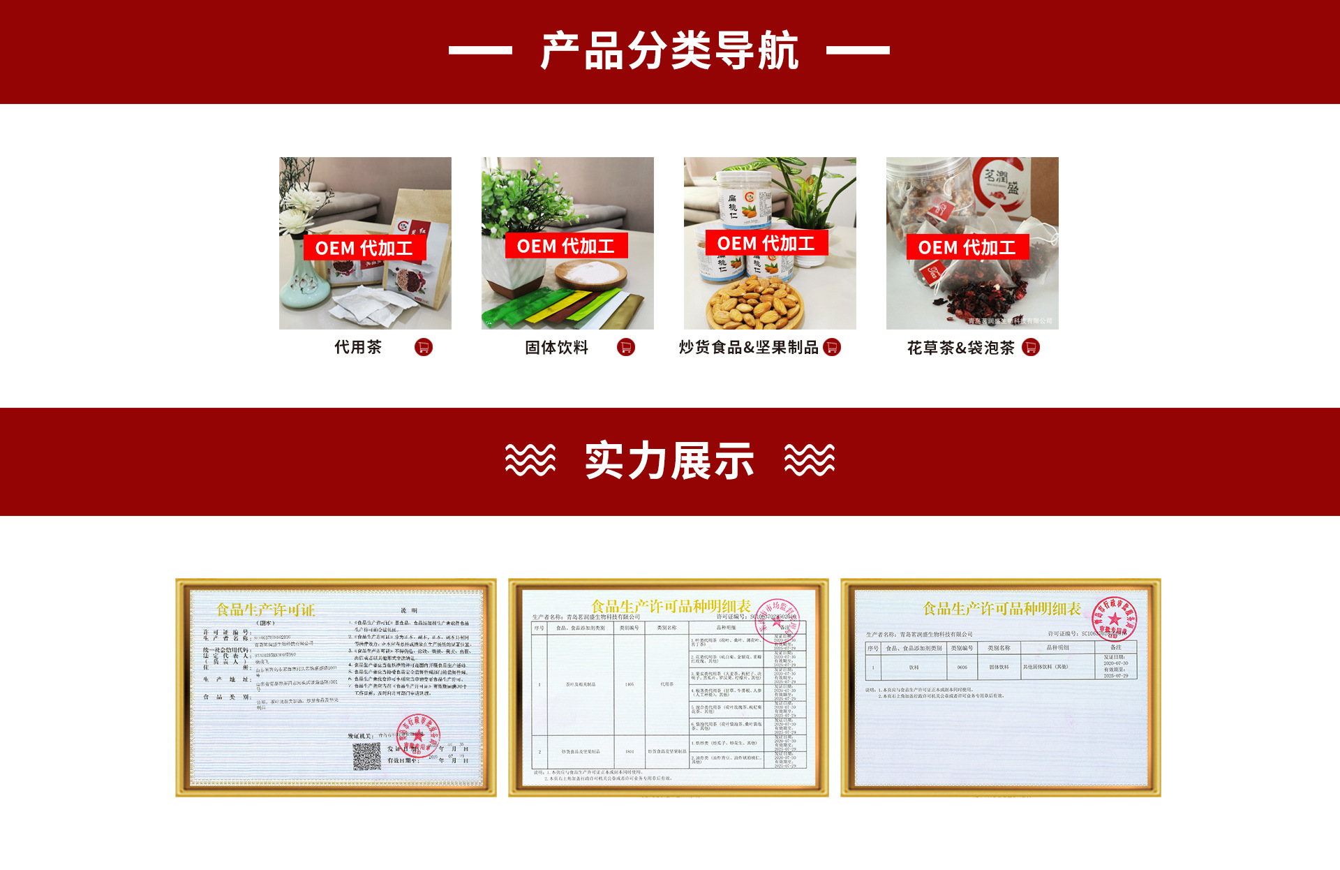 公司主营代用茶,袋泡茶,固体饮料,炒货食品及坚果制品等产品的专业oem委托生产加工和销售。公司秉承“顾客至上,服务第一”的经营理念,坚持“质量为先”的原则为广大客户提供服务,因为专注所以专业!