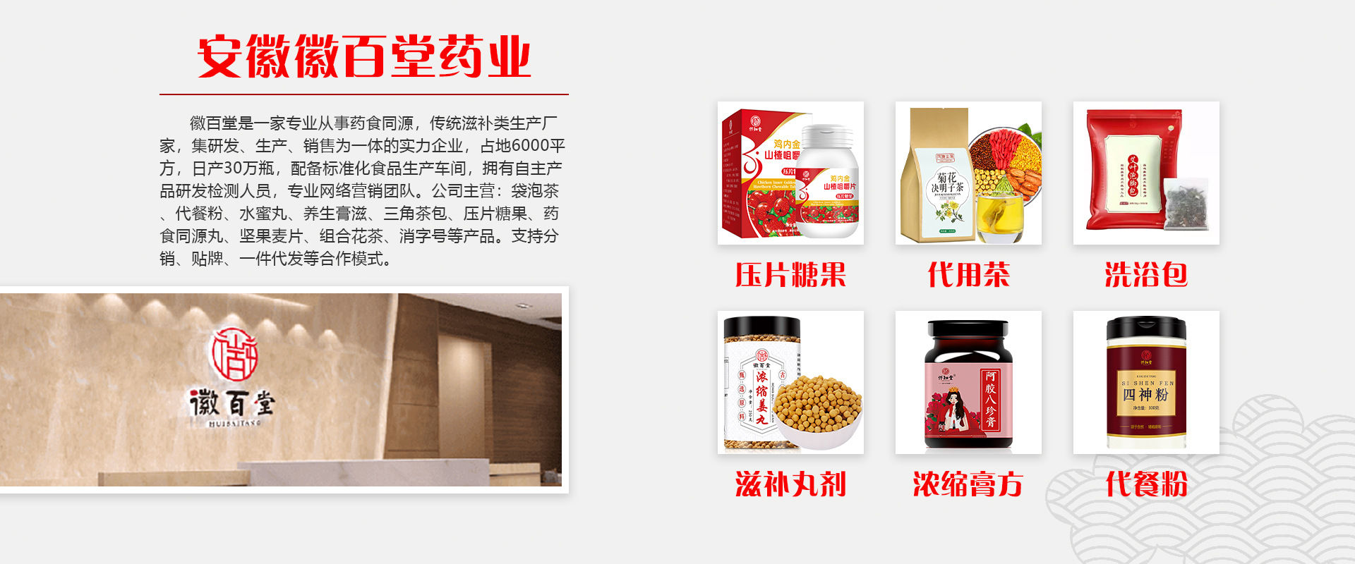 安徽徽百堂药业有限公司自有生产线,生产区域占地5000平方米。拥有丰富的生产经验,先进的标准化设备 ,食品级净化车间。集代餐粉、浓缩膏滋、代用茶、压片糖果、方便食品等产品线。
