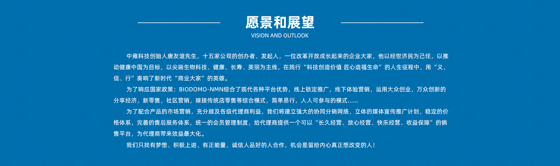 中雍生物科技有限公司一一专注于人类尖端生命科学研究,是一家集功能性保健食品,膳食营养补充剂,医药产品,检测试剂与健康类服务为一体综合性高新技术企业,是高端保健品行业的引领者,不断地通过引领行业的科技创新,让更多人受益。 中雍精准生物科技有限公司隶属于中雍投资集团,总部设于中国北京中雍投资集团大厦内,第二办公区位于中国北京卷石天地大厦B座,依托美国著名大学博士后及德国高端科学家研发团队,在德国建立了BIODOMO品牌系列的生产基地,在海南海口拥有跨境免税店和跨境物流集散中心。
