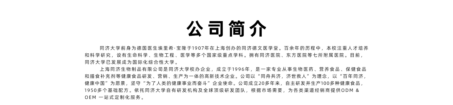 同济大学是教育部直属重点大学,创建于1907年,前身为德国医生在上海创办的德文医学堂,取名“同济”意蕴合作共济,同时涵盖了“同舟共济,自强不息”的学校精神。学校迄今已有超过100年的悠久历史,在长期办学中以“严谨、求实、团结、创新”为校训,致力于为国家培养高精尖人才,在多个领域做出了卓越贡献。 1993年同济大学的11个企业组建成上海同济科技实业总公司,并改制成为股份公司。1994年3月“同济科技”股票(代码:600846)在上海证劵交易所上市交易,是同济大学控股的综合性上市公司,注册资本6.2亿元。 上海同济生物制品有限公司是同济大学上海同济科技实业股份有限公司旗下参股公司之一,成立于1996年,是专业从事医药保健品、生物制品和动植物提取物等的研发、生产和营销为一体的高新技术企业。公司秉承了同济大学的科研实力和卓越声誉,汇集了同济、复旦等重点院校的一流高科技研发人才,将造福人类健康为己任,以打造一流企业为目标。 公司成立至今,已开发多个系列的高品质的适合大众的营养保健食品和医药生物制品,其中首脑、德丽姿、瑞尔福、爱茵宝等知名品牌系列产品一直深受国内外消费者的信赖与支持;同时,公司根据市场需求变化,不断对产品进行创新、升级,并结合多元化的市场营销手段,进一步巩固旗下产品在市场上的主导地位,创建无愧于百年名校的企业。