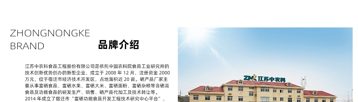 江苏中农科食品工程股份有限公司是依托中国农科院食品工业研究所的技术创新优势创办的新型企业,成立于 2008 年 12 月,注册资金 2000 万元,位于宿迁市经济技术开发区,占地面积近 20 亩。硒产品厂家主要从事富硒食品、富硒水果、富硒大米、富硒面粉、富硒杂粮等含硒高食品及功能食品的研发生产、销售、硒产品代加工及技术转让等。 2014 年成立了宿迁市“富硒功能食品开发工程技术研究中心平台”,2015 年成立了中国医科大学“硒人体健康实验地”。先后与江南大学宿迁技术研究院,中国医科大学老年******研究中心,中国科学院微生物研究所等多家科研机构达成战略合作,落地科研平台与宿迁总部,成立了中科先进(江苏)生物技术研究有限公司(涵盖研发、科技转化,研发满足市场需求的产品与服务通道)。公司已通过 ISO9001-2008 质量管理体系认证,并在 2013 年获批宿迁市级农业产业化农头企业单位。江苏诚信经营示范企业,中国品质信用企业协会会员单位,健康产业具有品牌影响力产品 。 2012 年建立了中农科“富硒食用菌原料培育基地”,2015 年建立了中农科“富硒生态园”。先后完成了市级科技项目“硒蛋白提取与分离技术”,省级科技项目“通过食用菌转化有机硒的培育技术及产业化运用”。目前已申请通过五项国家发明技术专利,七项实用新型技术专利,两项外观专利。企业生产的有机硒食用菌粉产品及水溶性有机硒菌粉等产品的吸收利用率高且有机硒含量达 99.9%以上。