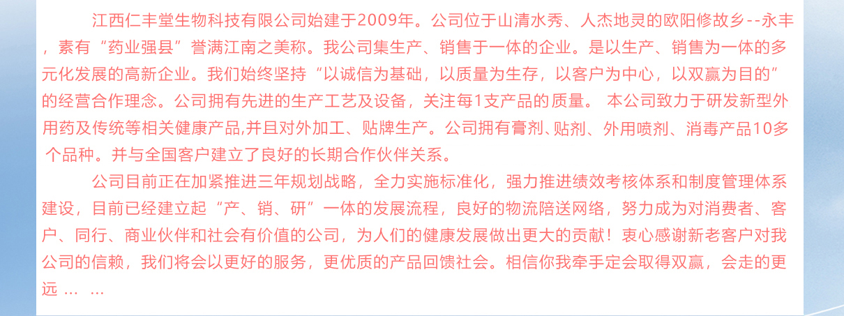 江西仁丰堂生物科技有限公司始建于2009年。公司位于山清水秀、人杰地灵的欧阳修故乡--永丰 ,素有“药业强县”誉满江南之美称。我公司集生产、销售于一体的企业。是以生产、销售为一体的多元化发展的高新企业。我们始终坚持“以诚信为基础,以质量为生存,以客户为中心,以双赢为目的”的经营合作理念。公司拥有优秀的化工专家及执业药师,拥有先进的生产工艺及设备,确保每1支产品的质量。 本公司致力于研发新型外用药及传统等相关健康产品,并且对外加工、贴牌生产。公司拥有膏剂、贴剂、外用喷剂、消毒产品10多个品种。并与全国客户建立了良好的长期合作伙伴关系。 公司目前正在加紧推进三年规划战略,全力实施标准化,强力推进绩效考核体系和制度管理体系建设,目前已经建立起“产、销、研”一体的发展流程,良好的物流配送网络,努力成为对消费者、客户、同行、商业伙伴和社会有价值的公司,为人们的健康发展做出更大的贡献!衷心感谢新老客户对我公司的信赖,我们将会以更好的服务,更优质的产品回馈社会。相信你我牵手定会取得双赢,会走的更远