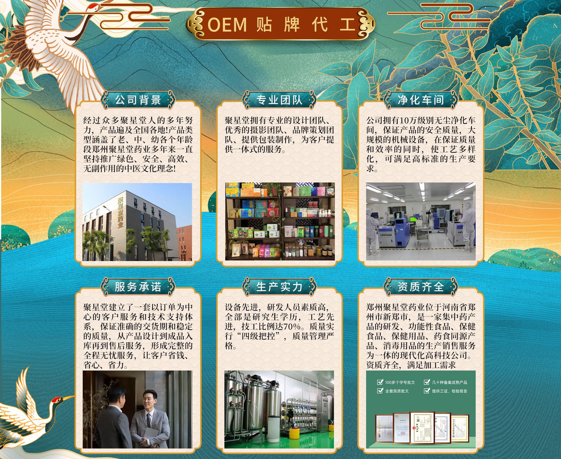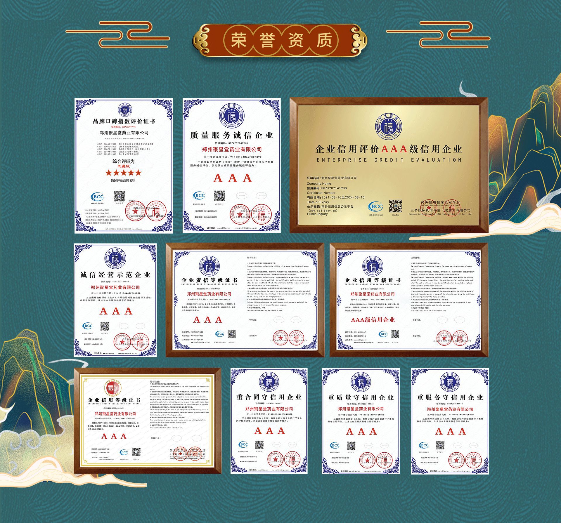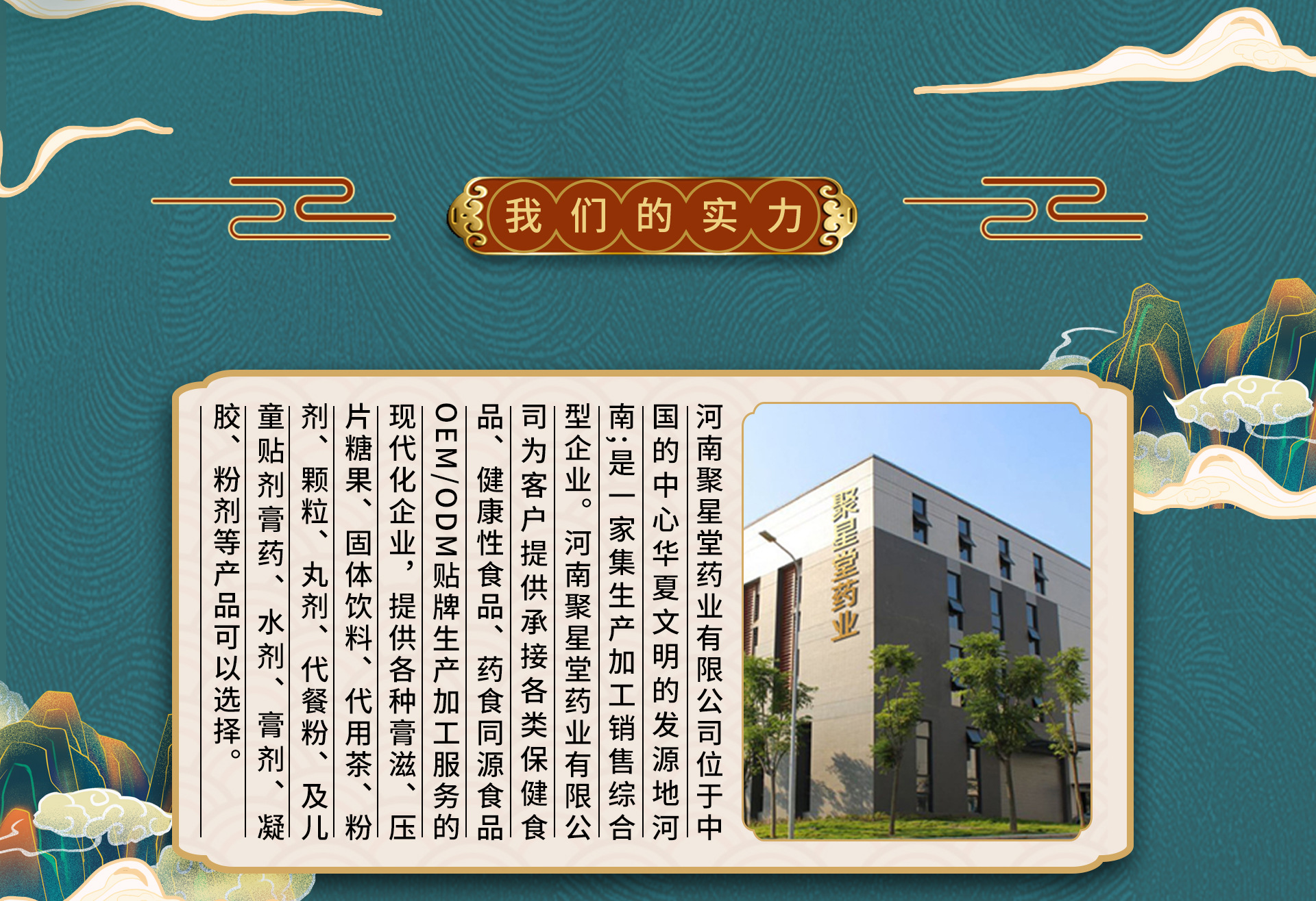 郑州聚星堂药业有限公司位于华夏文明的发源地河南省郑州市新郑市,是一家集中药产品的研发、功能性食品、保健食品、保健用品、药食同源产品、消毒用品的生产销售服务为一体的现代化高科技公司。现可生产粉剂、片剂、中药的丸剂颗粒剂、代用茶、膏滋、以及男女私护的洗剂、皮肤外用膏剂、膏药等多种剂型。经过众多聚星堂人的多年努力,产品遍及全国各地!产品类型涵盖了老、中、幼各个年龄段郑州聚星堂药业多年来一直坚持推广绿色、安全、高效、无副作用的中医文化理念!