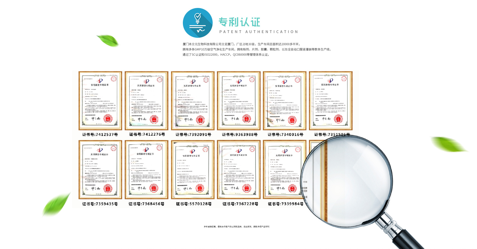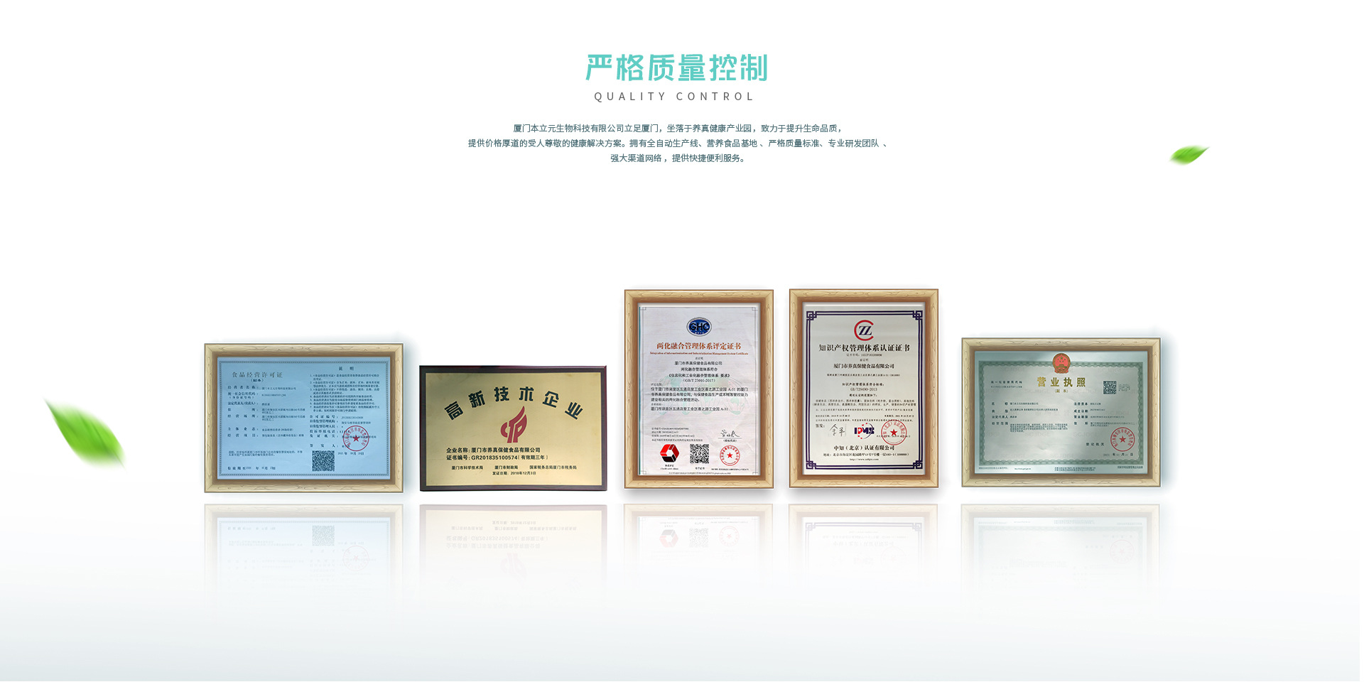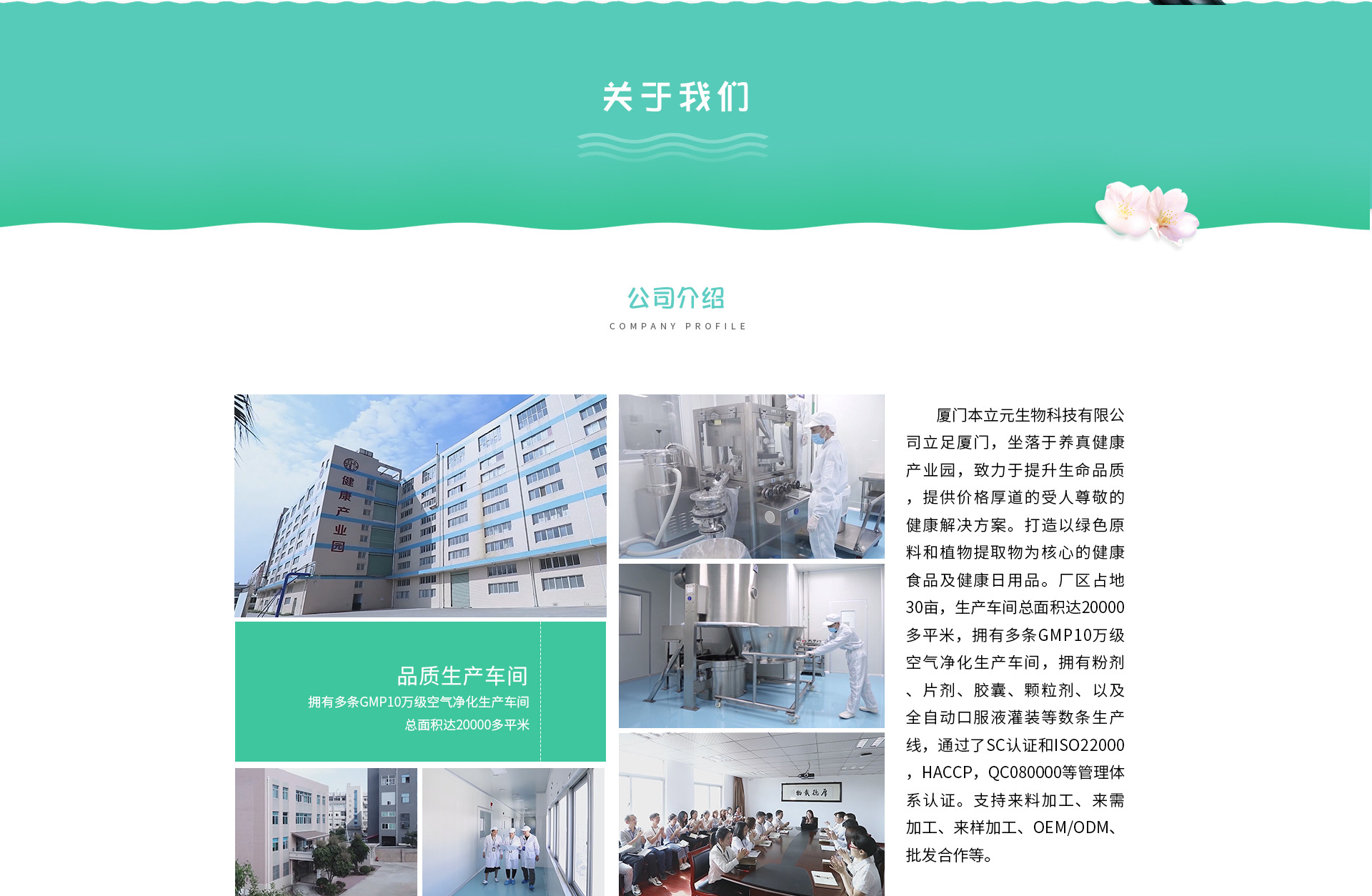 厦门本立元生物科技有限公司立足厦门,坐落于养真健康产业园,致力于提升生命品质,提供价格厚道的受人尊敬的一站式OEM健康解决方案,坚持绿色和环保的发展理念,打造以植物提取物和药食两用食材为原料基础的健康食品。厂区占地30亩,生产车间总面积达20000多平米,拥有多条GMP10万级空气净化生产车间,涵盖固体饮料、压片糖果、口服液、袋泡茶、胶囊等数条生产线,通过了SC认证和ISO22000、HACCP、QC080000等管理体系认证,支持来料加工、来需加工、来样加工、OEM/ODM、品牌合作等。