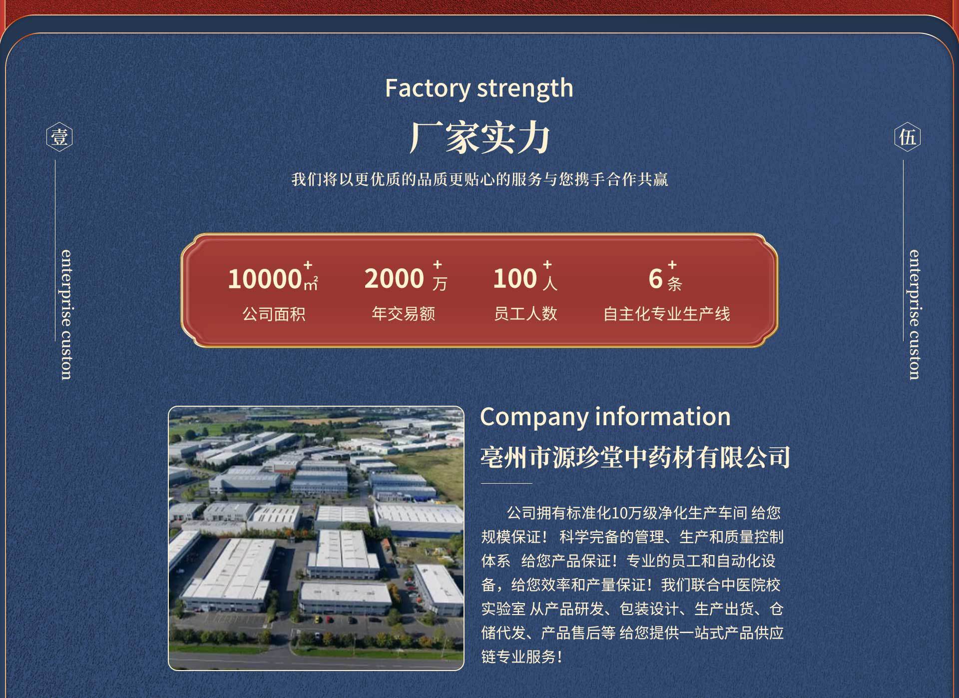 公司现有十万级标准净化生产车间3000余平方,仓储7000余平方。拥有6条自主化专业生产线,并建立了科学完备的管理、生产和质量控制体系。主要生产代用茶饮、固体饮料颗粒冲剂,功效型食品粉剂,养生糕点丸剂,冲调果浆膏滋,即食方便食品,泡脚料,罐头食品,压片糖果等主要产品类型,公司共有专业技术员工60余人,其中本科及以上员工20余人,均毕业于中医类相关专业等高校。现公司产品已上架于近4000家商超及药房医院。我们将以更优质的品质更贴心的服务与您携手合作共赢。