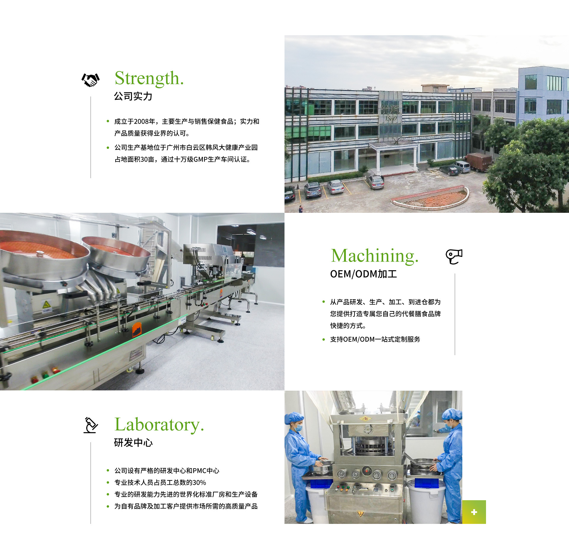 广州美春堂医药科技有限公司是等产品专业生产加工的公司,拥有完整、科学的质量管理体系。广州美春堂医药科技有限公司的诚信、实力和产品质量获得业界的认可。公司成立2008年,生产与销售保健食品。现生产基地位于广州市白云区韩风大健康产业园,占地面积30亩,首期投资5千万元,拥有国家食品药品监督管理局批准保健食品批文8个。今年即将获批8个保健食品,明年获批4个,历程6年。拥有保健食品、食品、特殊膳食食品生产线,通过十万级GMP生产车间认证。生产线年产产量:胶囊10亿粒,片剂10亿片、粉剂1亿袋、茶剂1亿袋。