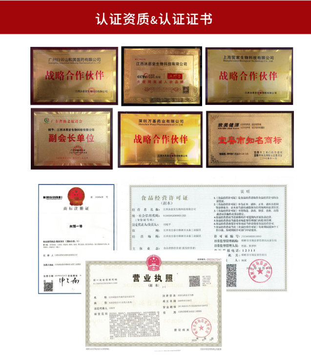 江西沐恩堂生物科技有限公司成立于2009年,座落在是为全国中药材的集散地和中药材加工炮制中心,享有“药不到樟树不齐,药不过樟树不灵”美誉,具有4000多年源远流长的医药文化历史江西四大名镇之一素有“中国药都”之称的樟树。 本公司是主要以保健食品的研制、生产、批发为一体的大型企业。目前在北京和上海与我国多个研究机构建立了战略合作关系,拥有数十台先进机器,聘请了全国知名的一大批具有科研管理、生产管理、销售管理、新产品开发经验的专业技术素质人才,聘请专业法律顾问,并逐步导入国际质量管理标准规范,注册商标保护。公司高瞻远瞩,积极与国际接轨,适应市场的科学管理网络,实施“产品质量为生命”战略,务必使产品的生产、包装、消毒等工艺达到国际水准,具备完整的净化车间。企业已通过国家GMP认证、QS认证,生产厂房按照GMP标准建立,拥有完整的化验室,检测设备齐全,为产品的质量提供了可靠的质量